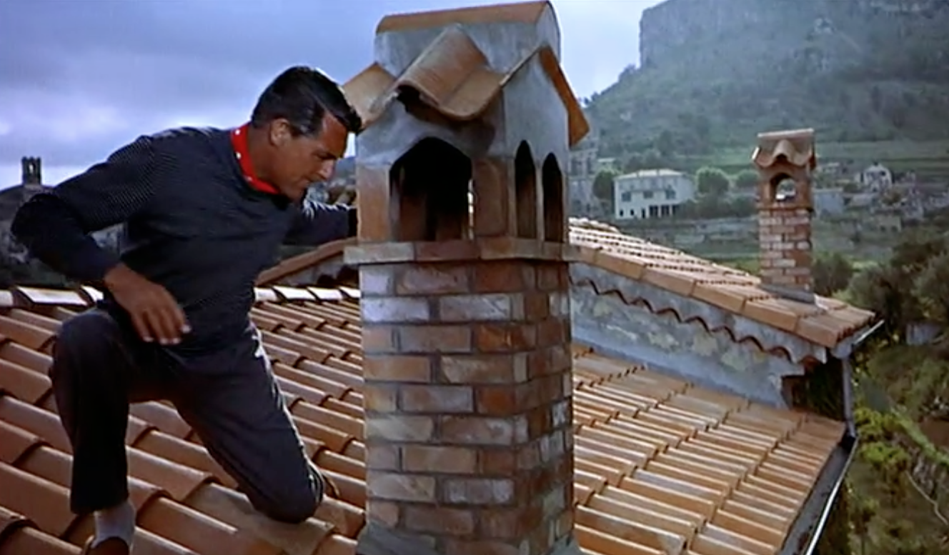 Cut to: Cary Grant in his “French casual” outfit of stripes and polka dot scarf tending to his vineyards and flowers at his villa.  He sees a suspicious vehicle, and goes stealth mode.To Catch a Thief Grant police arrivalThe police have come to take John Robie into custody, but he eludes them with a clever shotgun/rocking chair trick and his still sharp roof skills.  That’s why they called him the Cat!