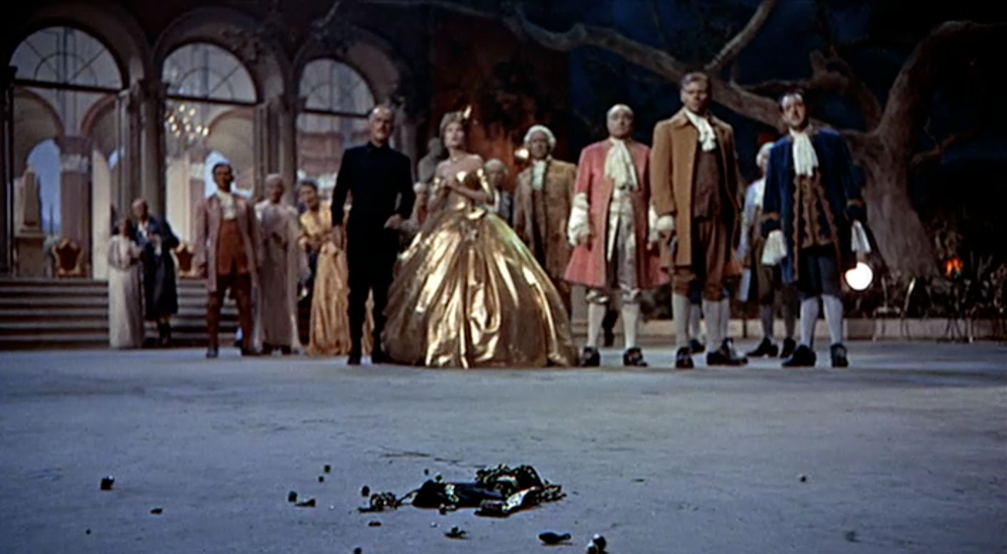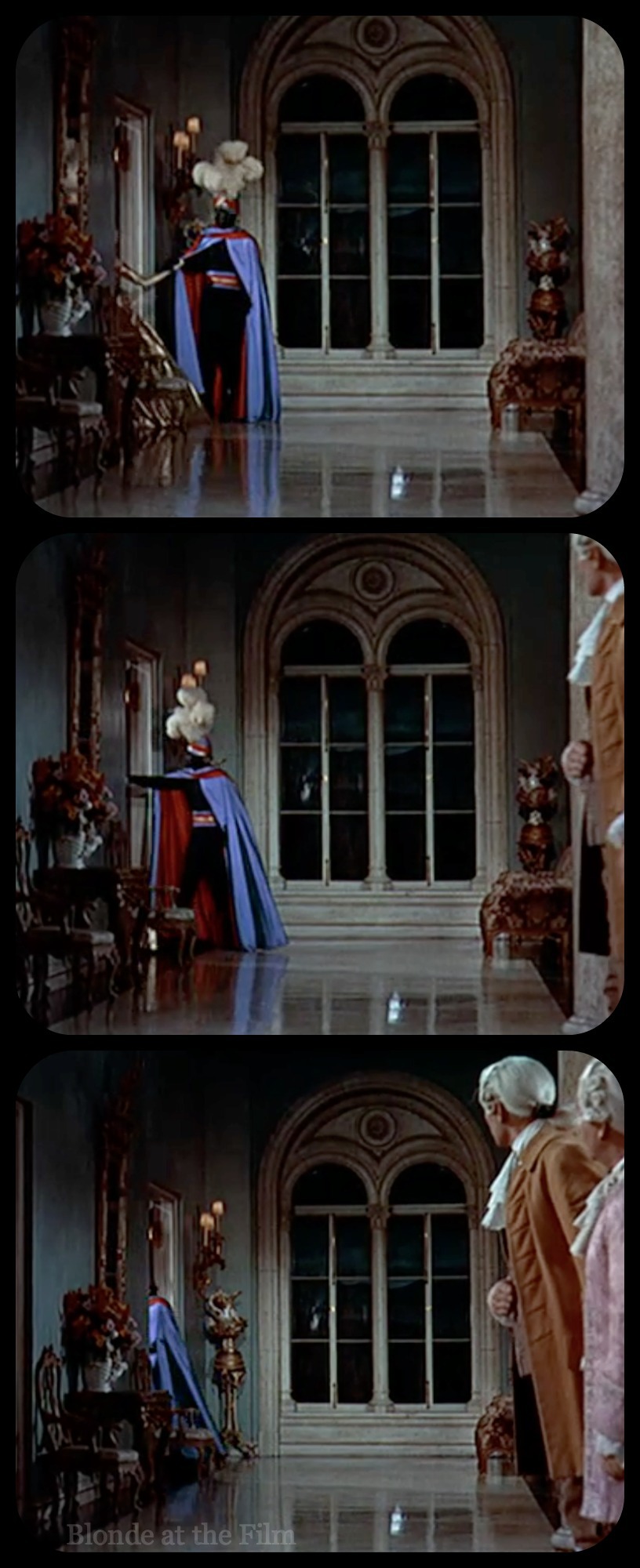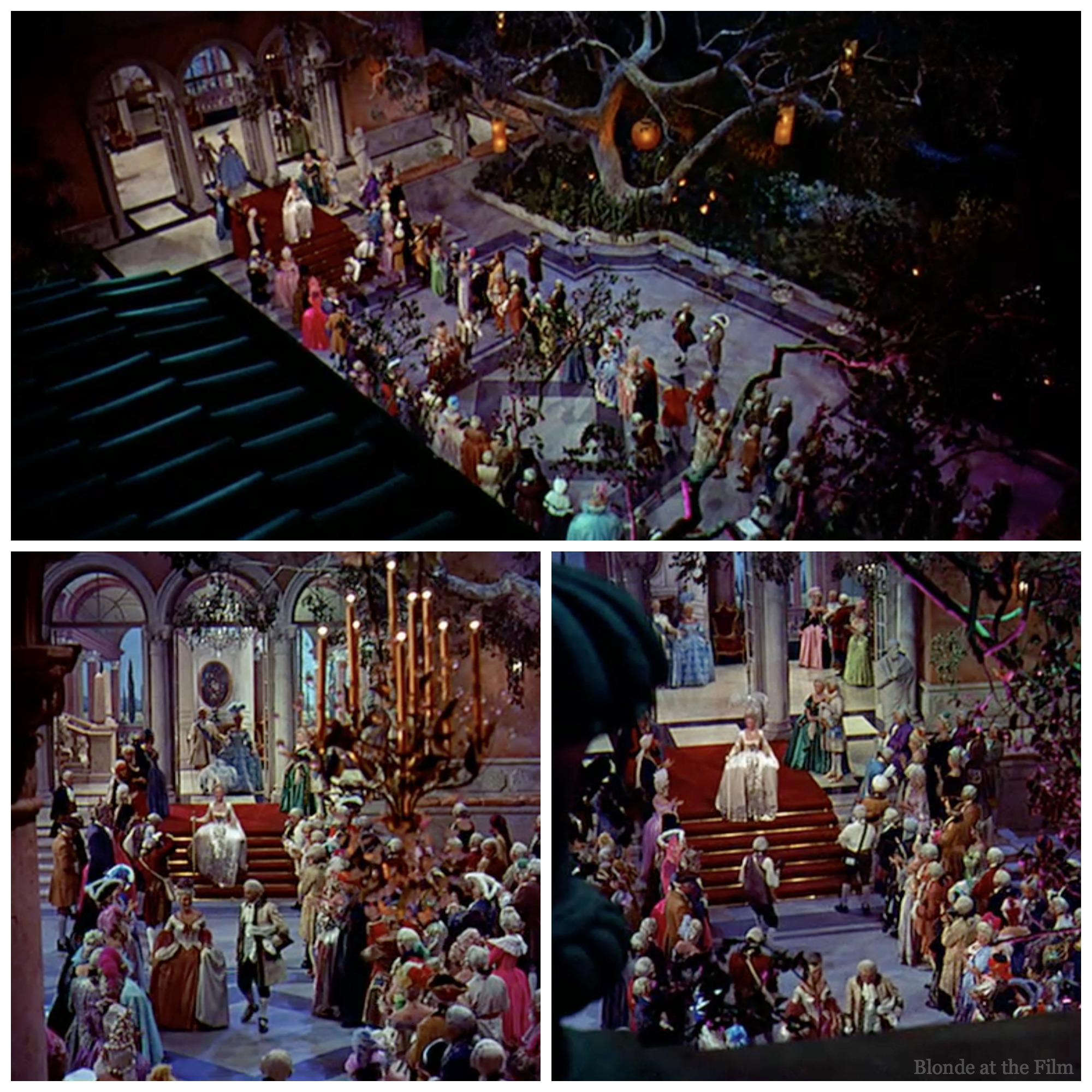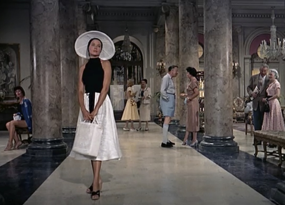 Edith Head, art directors Joseph MacMillan Johnson and Hal Pereira, and cinematographer Robert Burks did not disappoint.  The whole scene is a masterpiece of excess: colors, jewels, a gorgeous villa, champagne, fun camera angles, and oh, the gowns!  Guests bow to their hosts at the top of the steps and then parade down the line in a spectacle of wealth and look-at-me-ness.