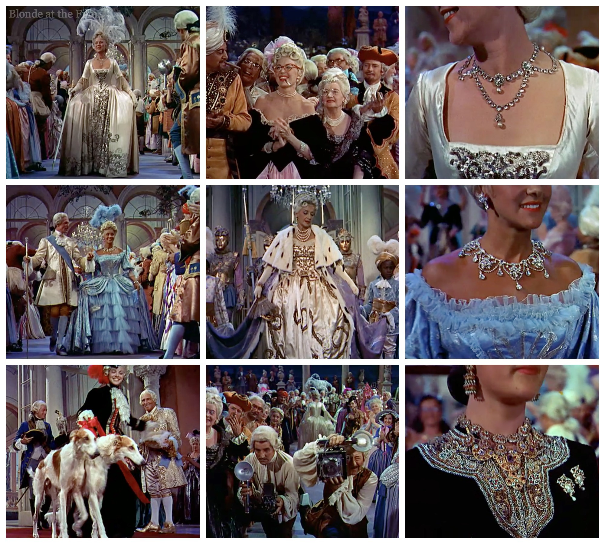 The parade of guests pauses for full appreciation of Jessie and Francie.  Jessie opted for cobalt velvet and be-feathered silvery-blue wig, with everything practically dripping with diamonds.  Francie went for gold: gold wig, gold dress, gold gloves, and gold birds.  It’s as if King Midas touched Snow White, dressed in her Marie Antoinette costume, as she was in the midst of singing to her bird friends.To Catch a Thief Kelly ball 1