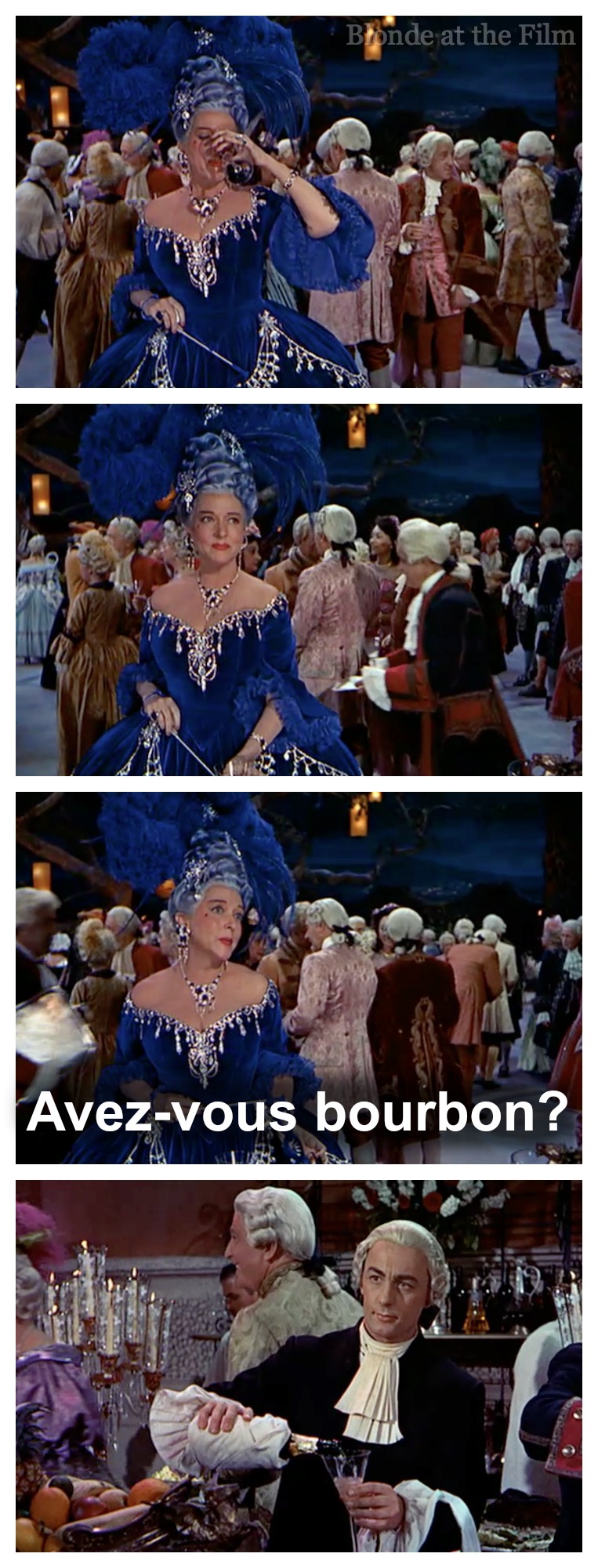 John, Jessie, and Francie enact their plan at the ball with misleading comments and swapped identities, along with non-stop dancing, but one of my favorite parts is when nervous Jessie slugs a glass of champagne, grimaces, and asks for a real drink in her horribly accented French:To Catch a Thief bourbonFrancie and John are the last guests to leave the party. They wait until the policeman following them arrive in the hallway before Francie pulls John inside her room.