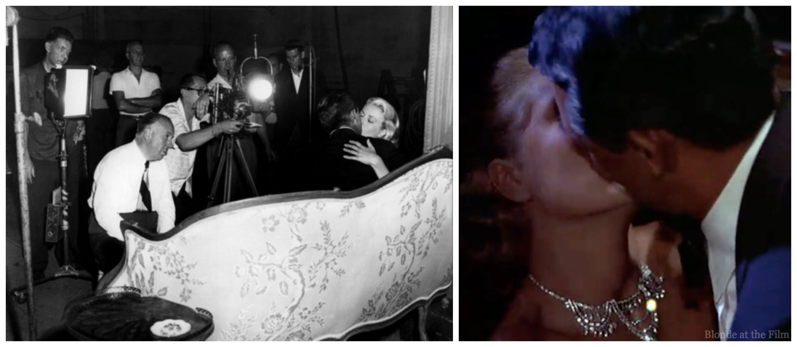 Hitchcock refused, and he won that battle.  I think the fireworks cut the serious seduction nicely and give the scene an amusing flair.  You can watch it here.  (This scene, and other iconic moments from Hitchcock’s films, was re-imagined in a 2008 Vanity Fair spread starring Gywneth Paltrow and Robert Downey, Jr.  Ehh, can’t compete with the original.)