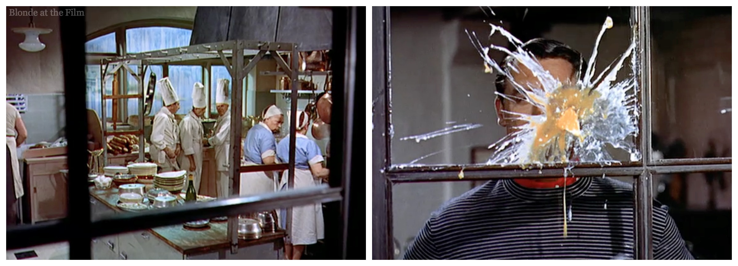 The film was shot using Paramount’s high resolution, widescreen technology VistaVision which they’d premiered with White Christmas (1954).  VistaVision is not as crazy-wide as CinemaScope, but the widescreen format works for a movie like this filmed in such a gorgeous place and packed with people.  I was harsh on Daddy Long Legs‘ use of CinemaScope, but Thief utilizes VistaVision well.To Catch a Thief Grant restaurantThe sommelier and the owner, Bertani, do not seem pleased to see John.  He heads for the kitchen, and those people are even less enthused about his presence.  One of them throws an egg at him as he looks in the window.  What is going on?