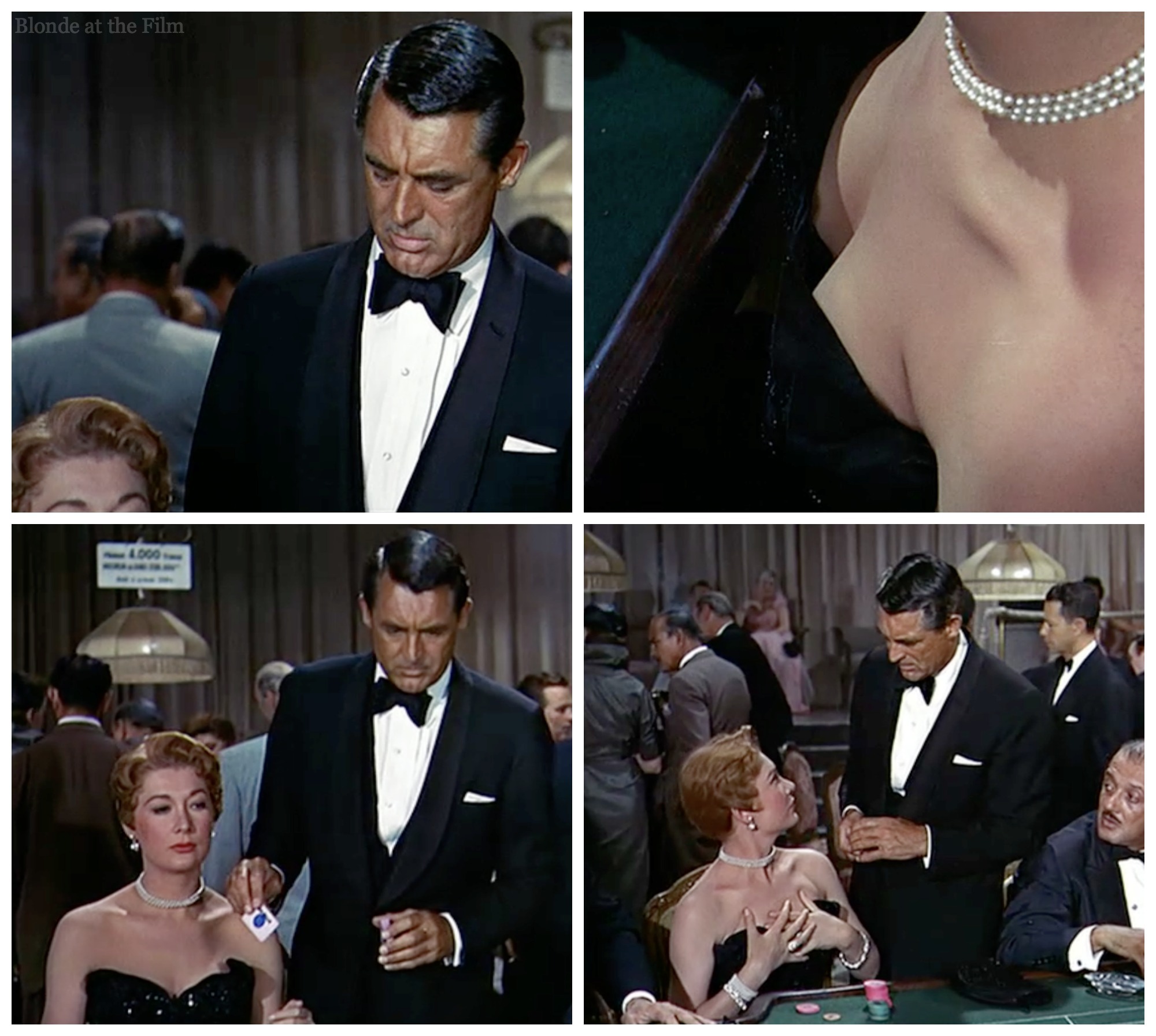 John positions himself across the casino from Jessie and Francie and contrives a unique way to get their attention, thanks to a strapless gown and a poker chip.To Catch a Thief Grant gamblingJohn drops the chip down the woman’s dress, and the poor thing is too embarrassed to pull it out and give it back.  It’s exactly the sort of stunt designed to get Jessie laughing and Francie intrigued.To Catch a Thief Grant gambling 2John joins them for a drink, pretending to be an Oregonian lumberman on vacation, and Jessie is immediately his best friend.  Let the games begin!