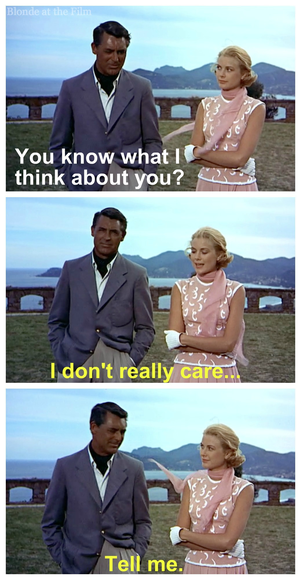 Francie is a handful, and poor John just wants to catch the Cat and go back to his grapes. But he’s intrigued by her, despite himself.  He seems taken with her independent boldness.To Catch a Thief Grant Kelly villa convo text