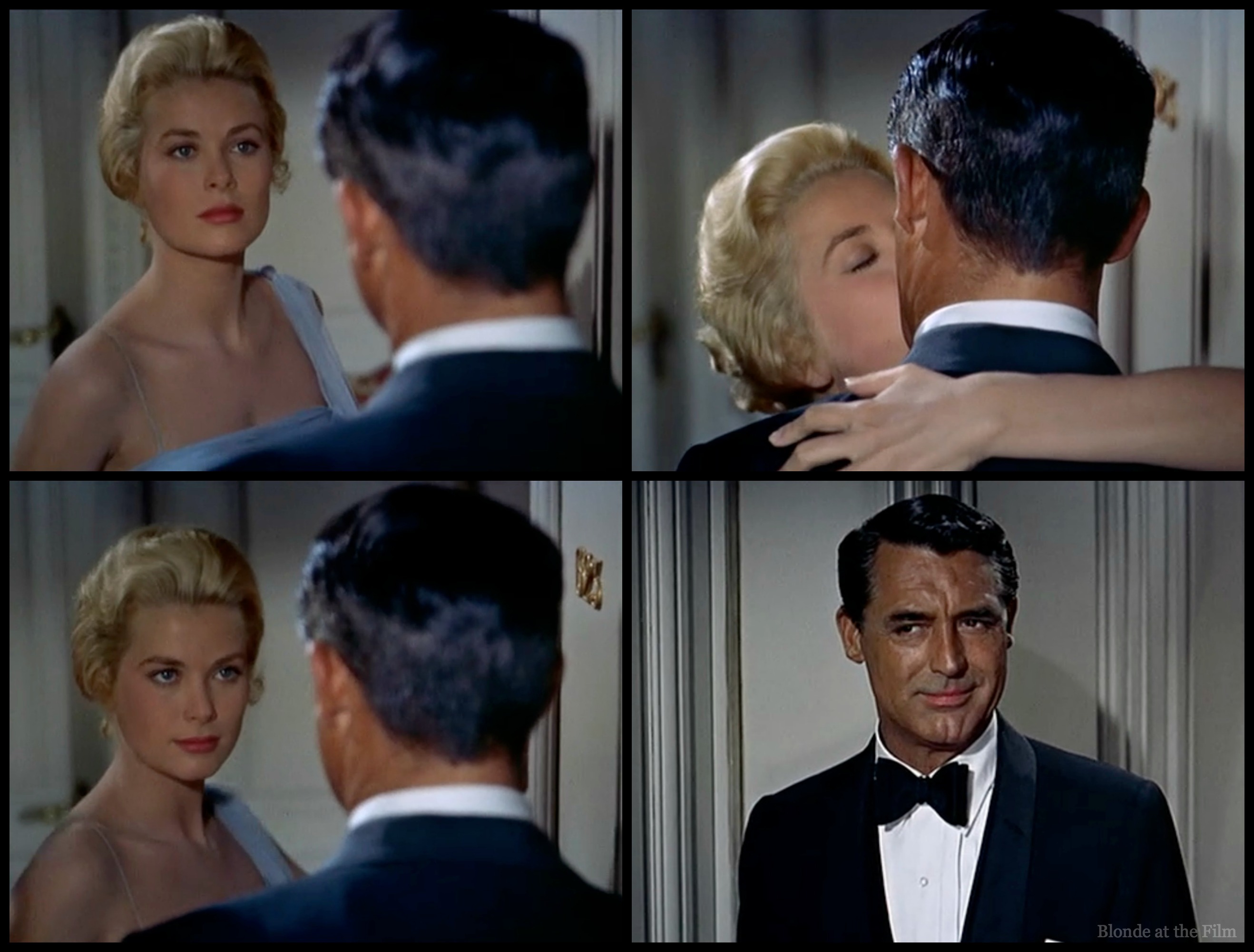 Francie is aloof and cool during this entire sequence, and she seems a bit embarrassed by her mother’s folksy conversation and strong opinions.  She’s also wary of handsome men.  She’s young, beautiful, and wealthy, so she’s been chased quite a bit by fortune hunters and hopeful suitors.  But when John walks Francie to her suite…she kisses him and then calmly shuts the door in his face!To Catch a Thief Kelly Grant kissShe’s not as innocent or cold as she appears; the kiss suggests that she’s just bored.  Fun fact: Room 623 at the Carlton, where this kiss was filmed, is now known as the Alfred Hitchcock Suite.