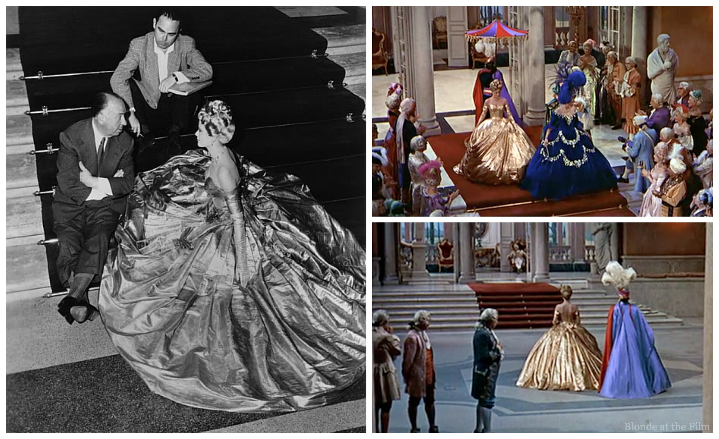 To Catch a Thief ballThey’ll attend a costume ball at one of the villas on his list, and hope that the Cat will be there to relieve the guests of their jewels.  “Grace needs a standout 18th century style ball gown, Edith!  I’m thinking gold,” Hitchcock said.  (Or so I imagine).