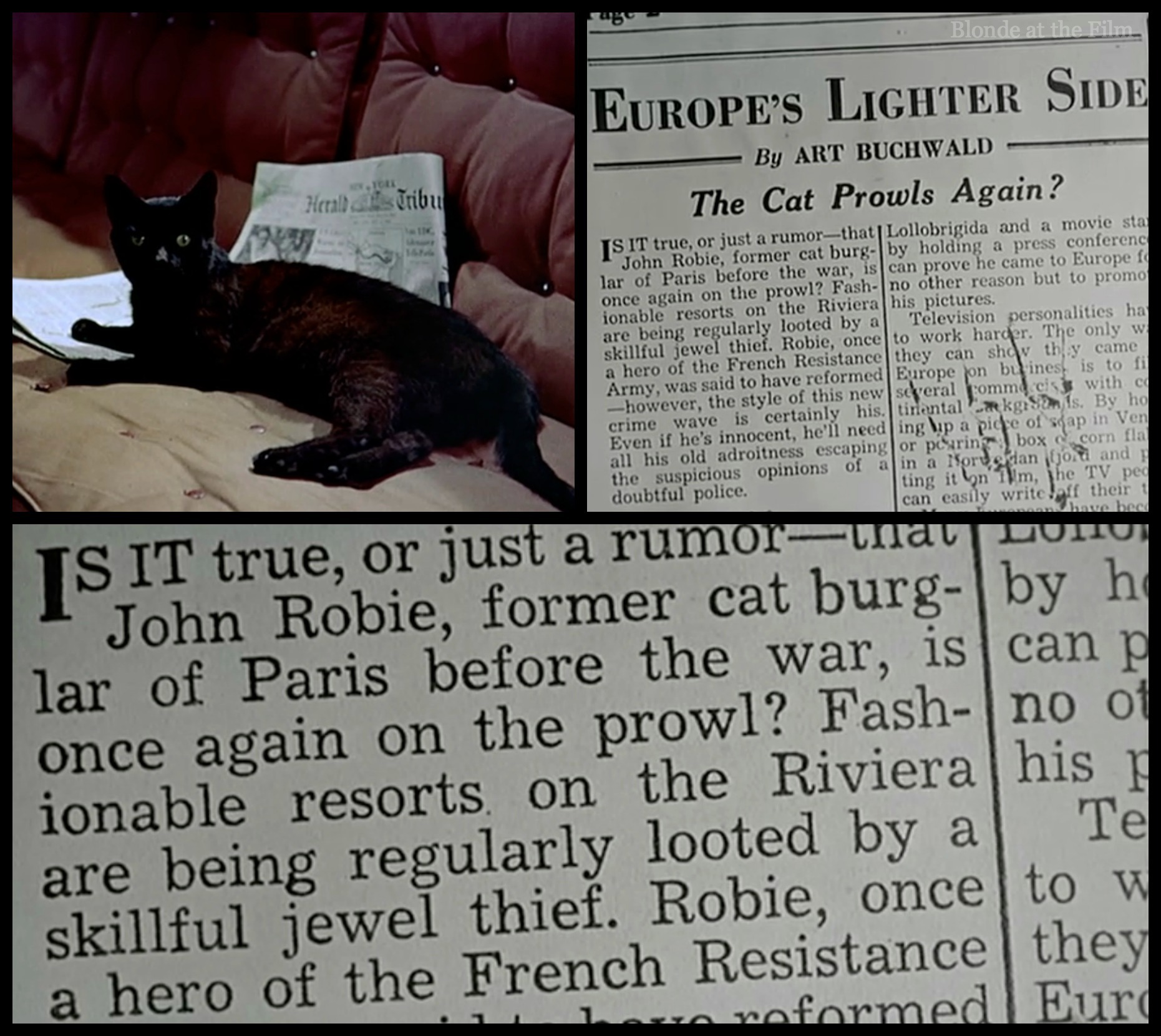 To Catch a Thief begins with the credits over a tourist office window before moving to the Carlton Hotel in Cannes.  It’s not happy there, at the moment, because a master jewel thief is emptying the jewelry boxes of wealthy hotel guests.  Shots of screaming women, empty jewel cases, and a black cat traipsing across nighttime rooftops with that insouciance only cats possess, set the scene quite nicely.  You can watch it here.  The juxtaposition of cheerful tourism posters and screams of “My jewels!” is an intriguing shock.To Catch a Thief opening robberiesPolice scurry, but seem unable to stop the thefts up and down the Riviera.  Then we get some helpful context in the guise of a black cat atop an English-language newspaper.  Thanks, Hitch.