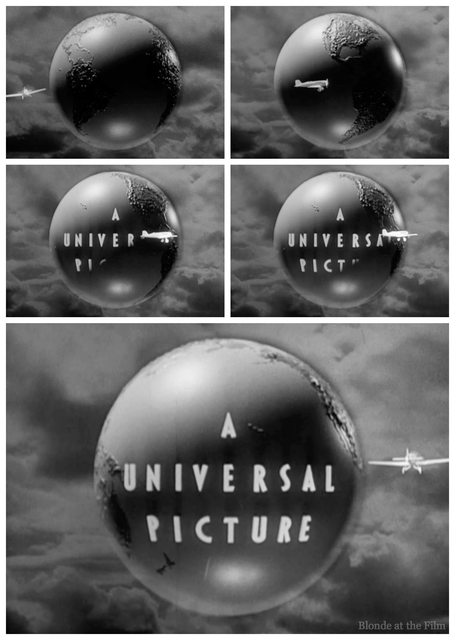 The movie begins with an adorable animated Universal logo. The little plane flies around the globe, and the words appear as it passes.