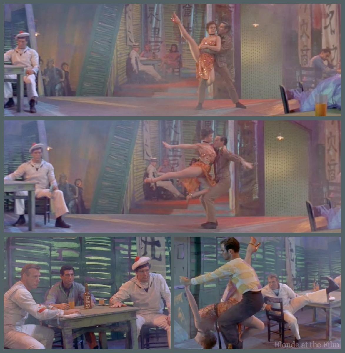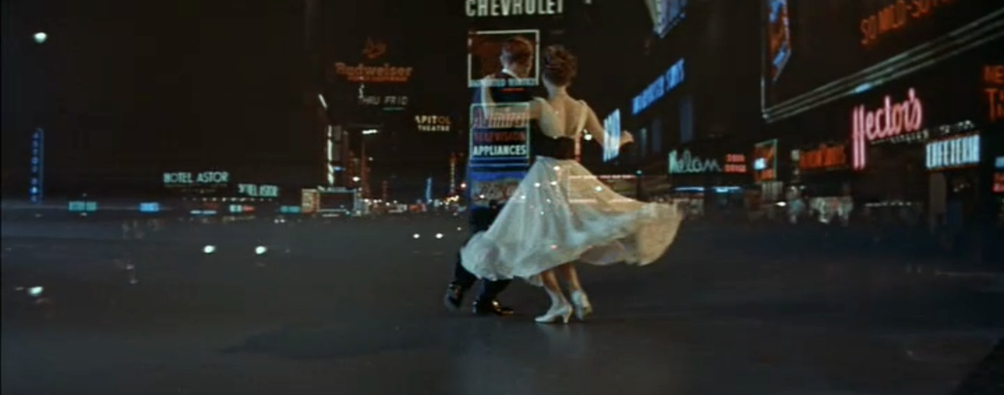 They dance out the door and keep at it as signs of New York hotspots flash by. In her autobiography Thank Heaven, Leslie Caron remembers that they never actually rehearsed this “Nightclub montage.” She was busy rehearsing the “Nightmare Ballet” when she was told to hurry into makeup and hair: they’d budgeted a whole day for Astaire to film a solo scene, but he’d done it in one perfect take, and he wanted to knock out the “Nightclub montage,” too.
