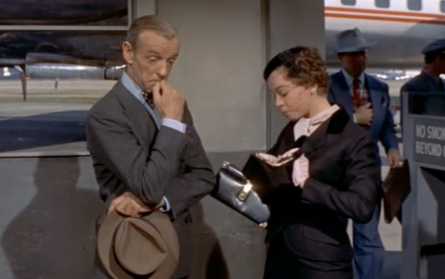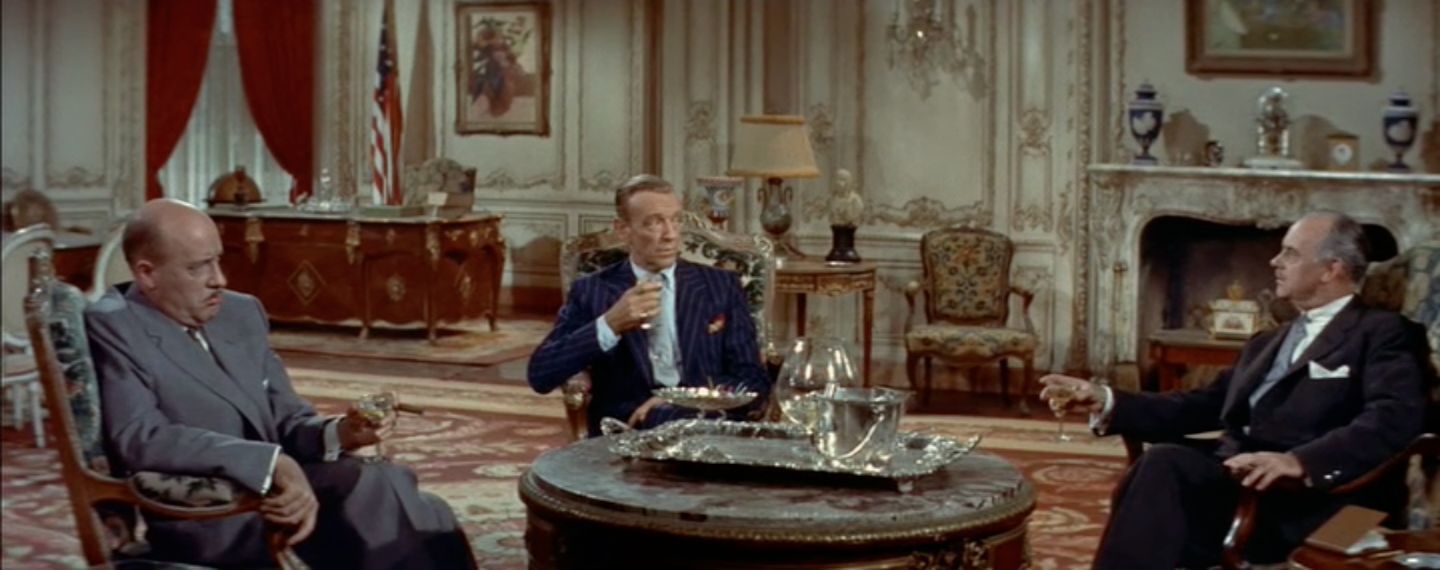 Number three is reinforced when jazz blares out of an opened door upstairs. Jervis likes to drum along to his favorite records, even when his right hand man Griggs (Fred Clark) is trying to discuss stocks and State Department trips. Jervis is not an uptight, dull millionaire, you see. His tie is even untied! What a fun loving guy he must be. Since he’s also Fred Astaire, it’s a safe bet there will be an inventive dance happening soon.