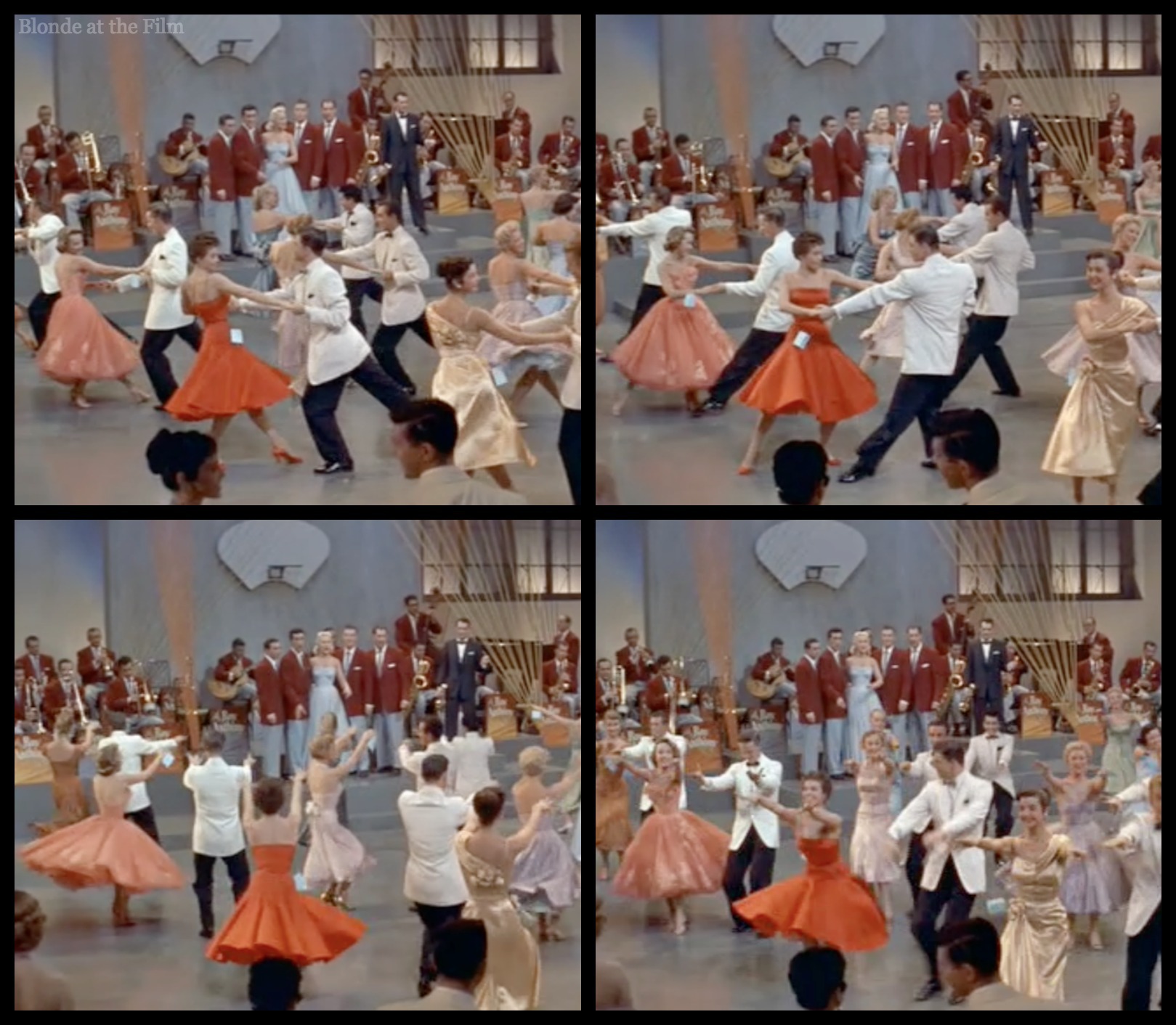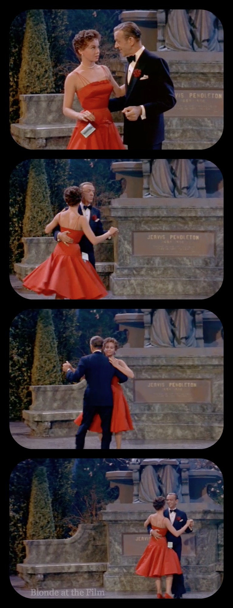 Astaire watches Julie with a big smile on his face. Then the group of young men he’s standing with suddenly surge forward, jostling him so that he accidentally ends up on the dance floor, displacing Jimmy as Julie’s partner.