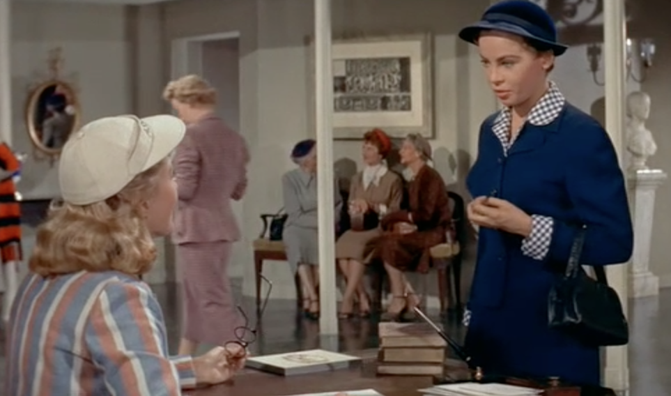 She opens the trunks, and it’s practically heaven. Linda pulls out the hanging bar (these trunks are amazing) and slides dress after dress out of the trunk. Sally says, “I’ll swap you a date with my brother for a chance to wear this dress!” It’s also fun because later on we see Julie in that flame colored dress, and in the cream-colored printed day dress. We never see that blue strapless number, unfortunately. Costumes for this film were designed by Charles LeMaire and Kay Nelson.