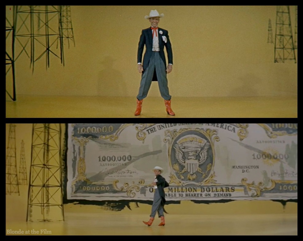 This section of the ballet is notable as the only time in Astaire’s career that his voice was dubbed–the deep cowboy voice belongs to Thurl Ravenscroft, who also voiced Tony the Tiger and sang the original “You’re a Mean One, Mr. Grinch.” I suppose Ravenscroft’s deep, textured bass voice suits the scene better than Astaire’s slender tenor.