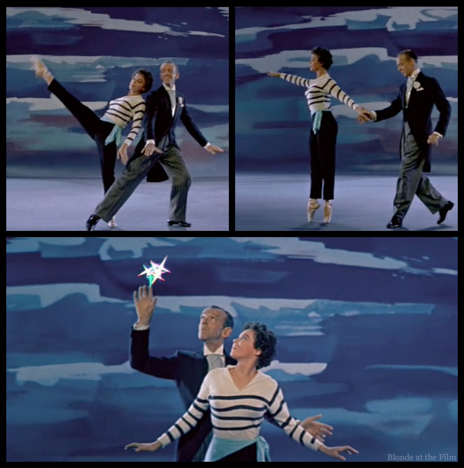 Then they have a lovely duet in a blue world. Although this is a beautiful dance that incorporates ballet elements to showcase Caron’s skills, I think the CinemaScope is a bit wasted. With just two people the space looks absolutely huge. It works okay because the backdrop suggests they are dancing in the sky or something, but I think Astaire’s choreography works better in a less extreme ratio. His precision and grace don’t need CinemaScope to come across on film, and they get a little lost in the widescreen.