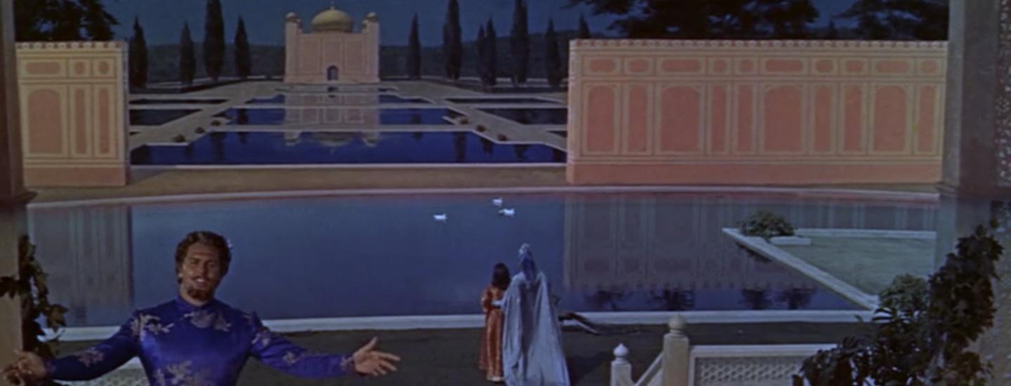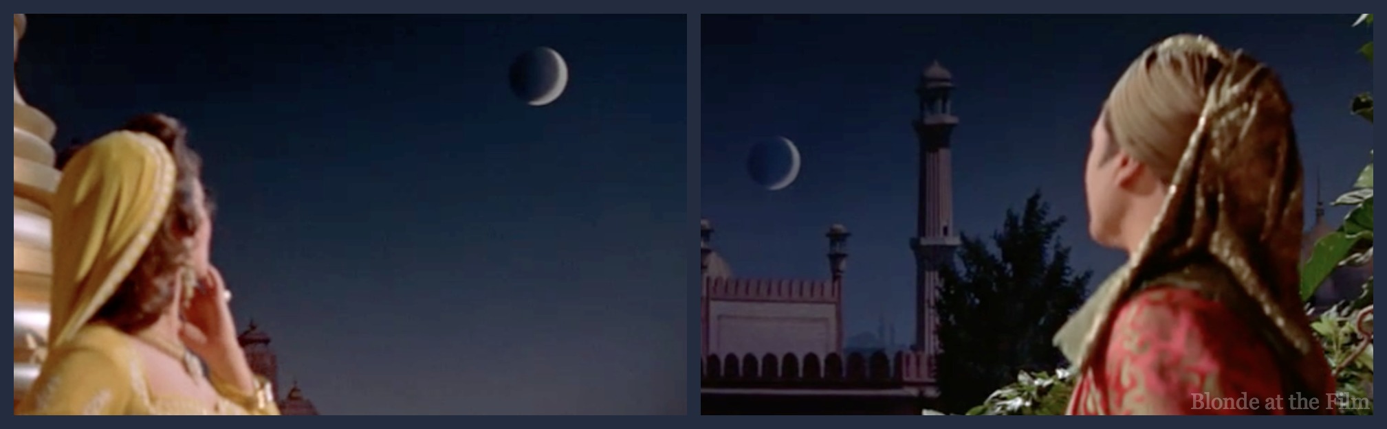 I love how Minnelli chose to transition from Marsinah to the Caliph: Marsinah sings, gazing at the moon, and we track forward towards the moon until Marsinah disappears from the frame. Then we track back away from the moon to find ourselves with the Caliph on some other terrace in Baghdad. It’s a beautiful way to move between spaces, and it’s a nice thought–they’re both singing to the same moon!