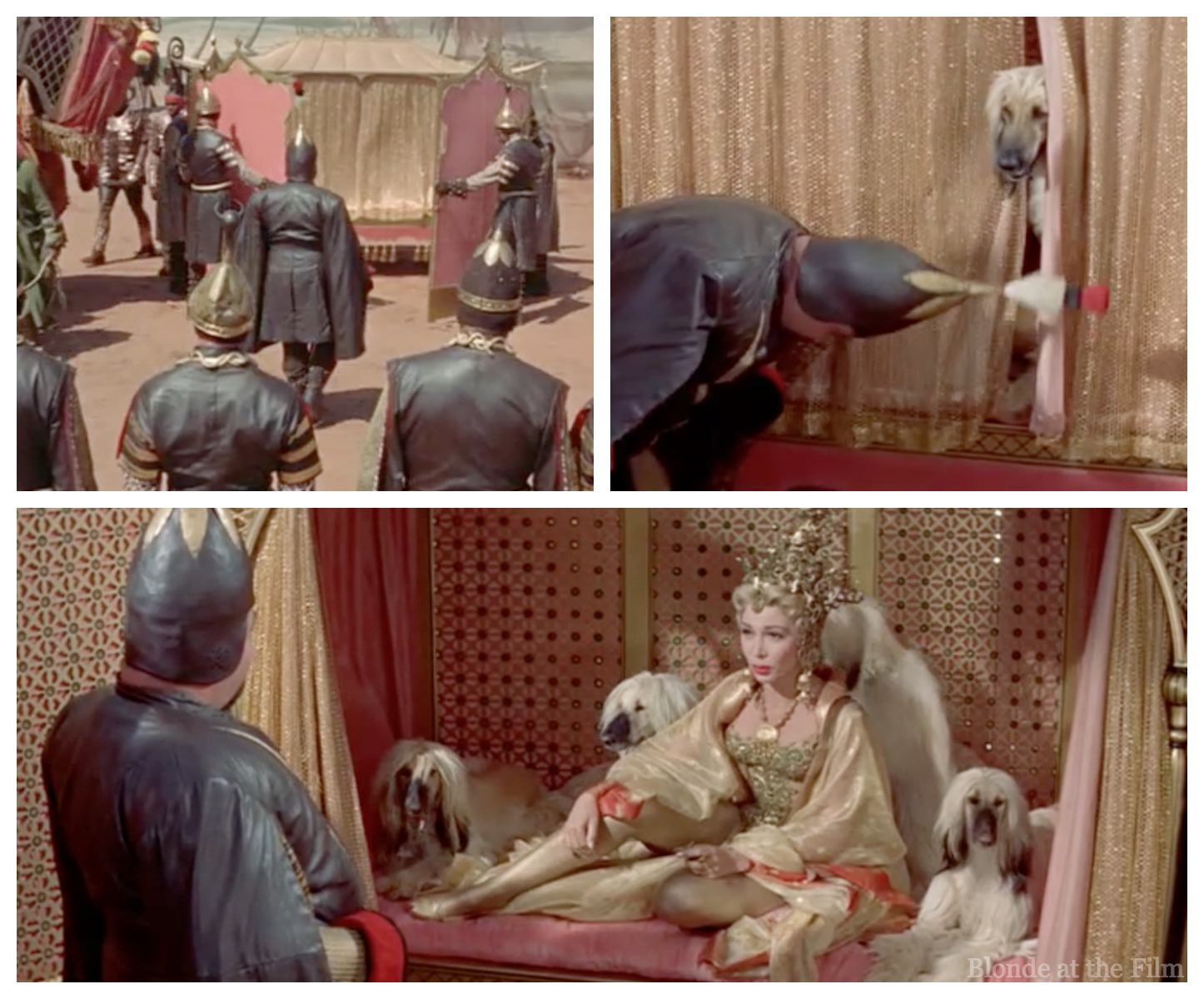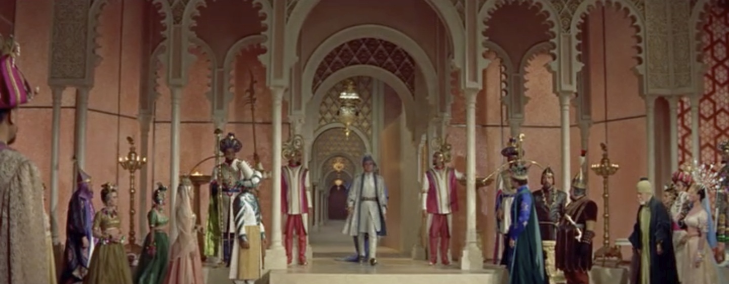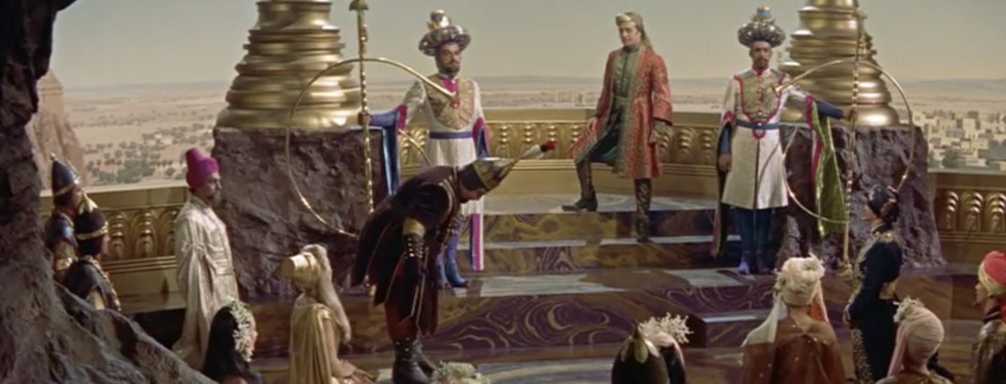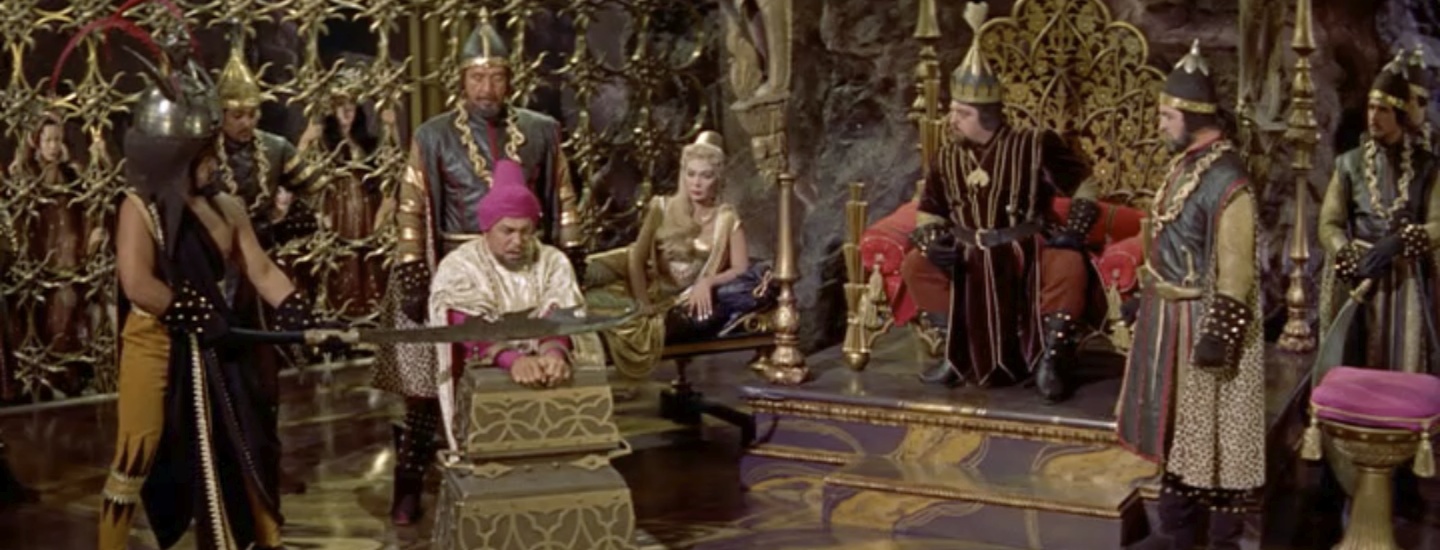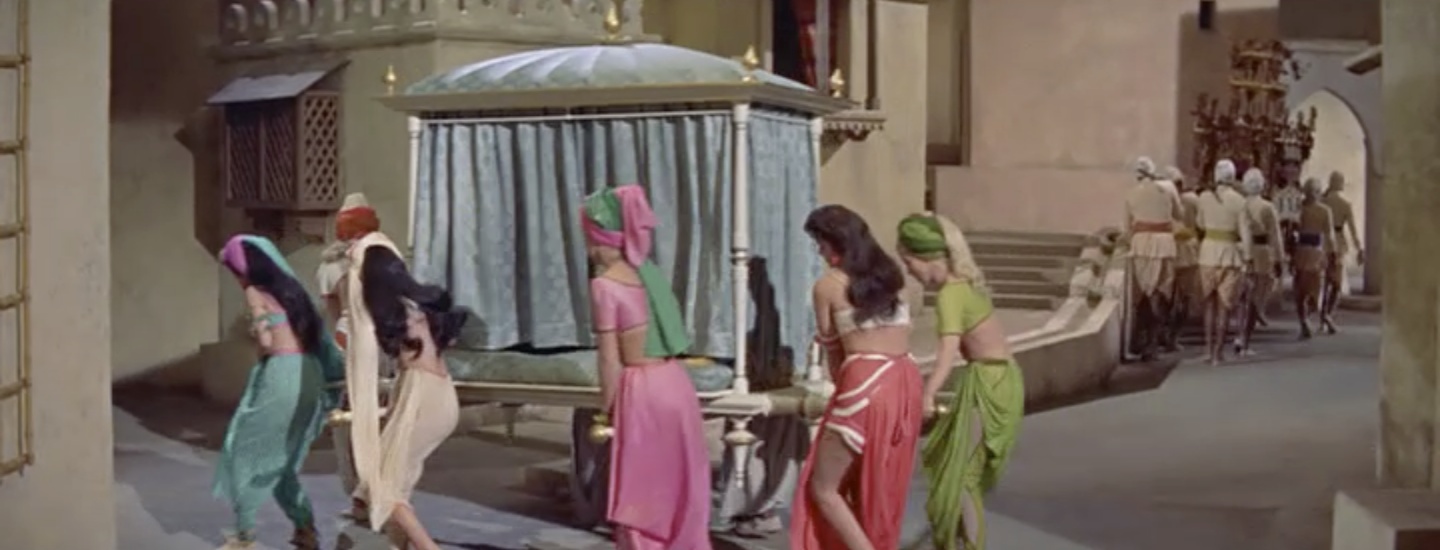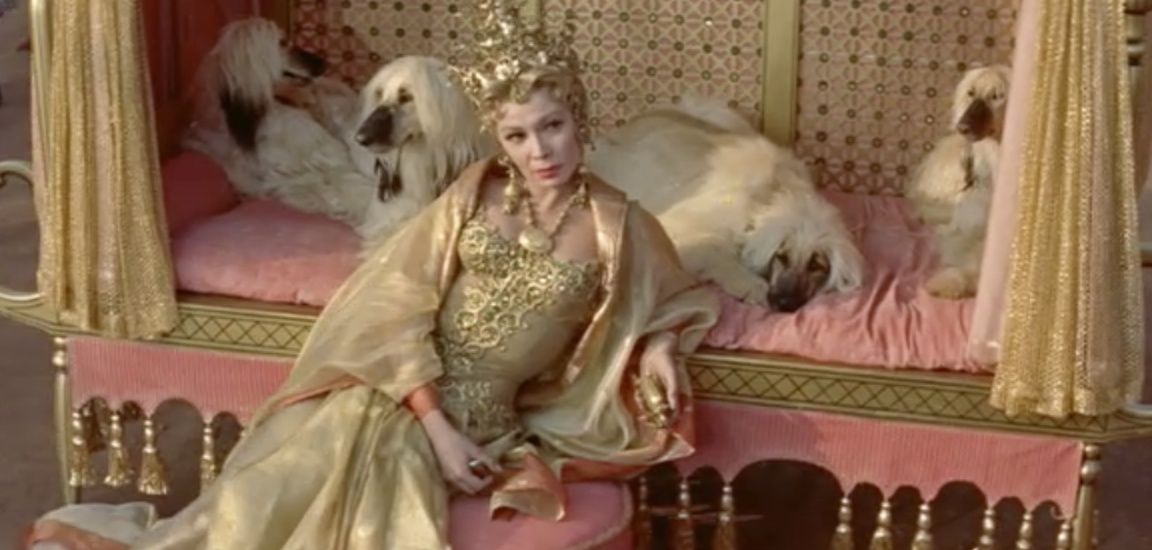 Meanwhile, the Wazir’s wife, Lalume, returns from a diplomatic mission. The Wazir (Sebastian Cabot) greets his wife’s shimmering pink and gold litter, but he’s discomfited when one of her dogs receives his bow instead of her…
