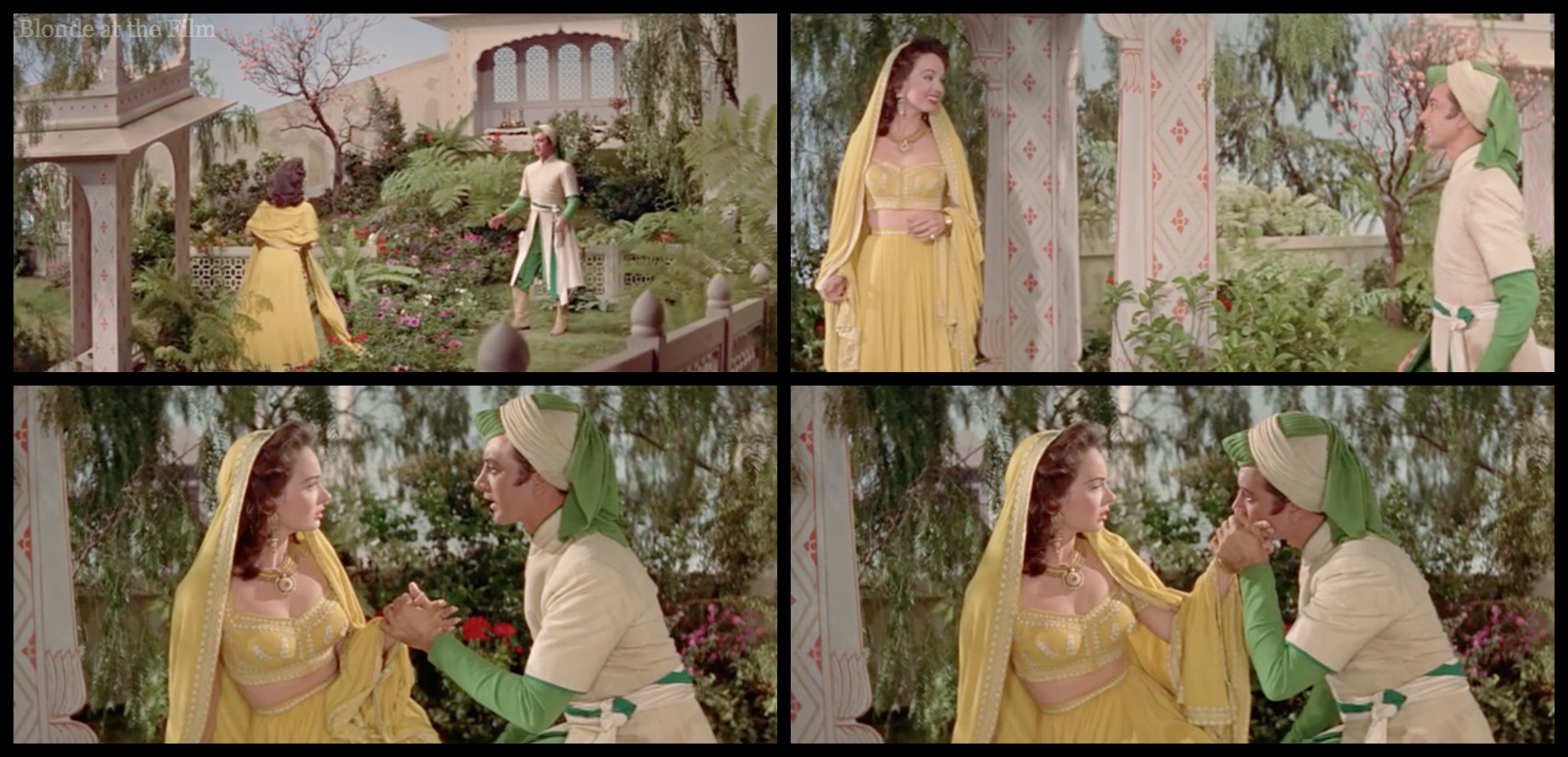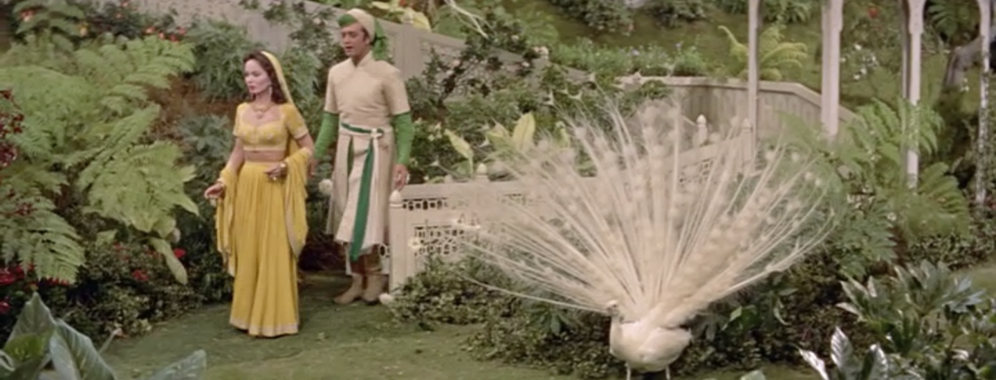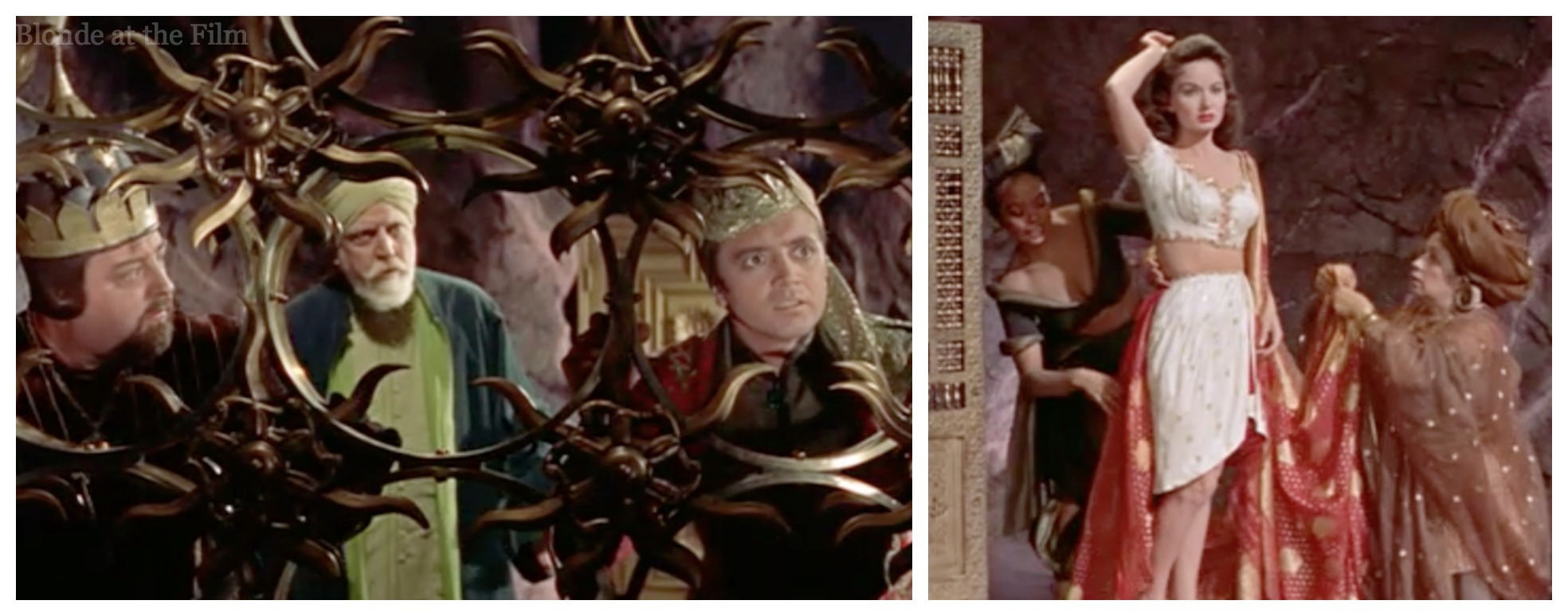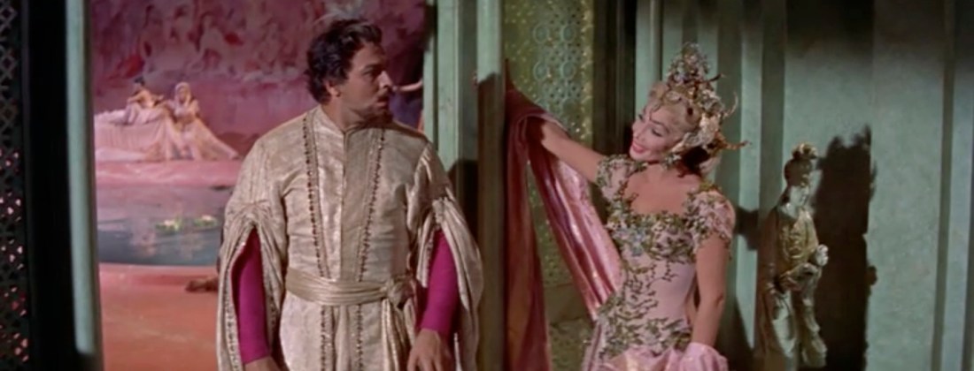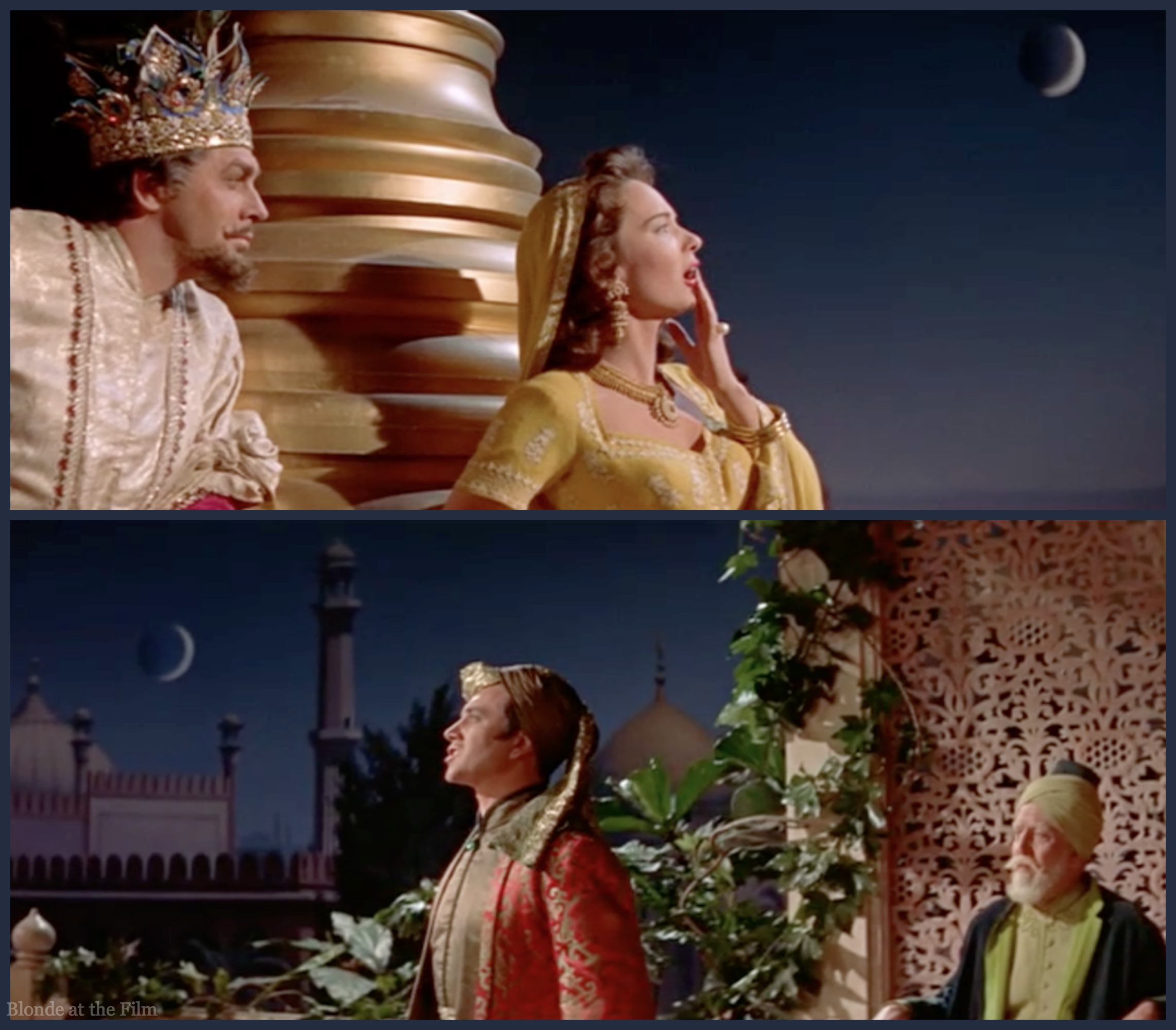 The Wazir thinks fast and claims that she is one of his many wives. The Caliph is devastated. His love is already married! In his sorrow he agrees to choose another bride that very night. This gives the Wazir his chance! And it gives the filmmakers another excuse for a shiny Howard Keel costume and a princess dance party.