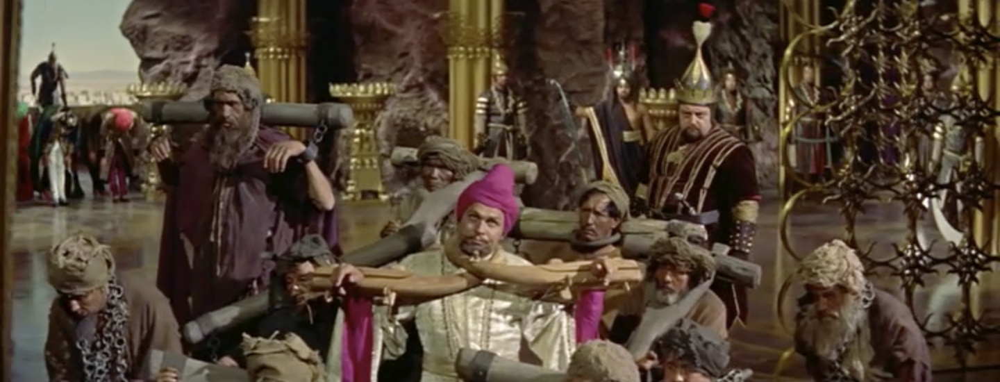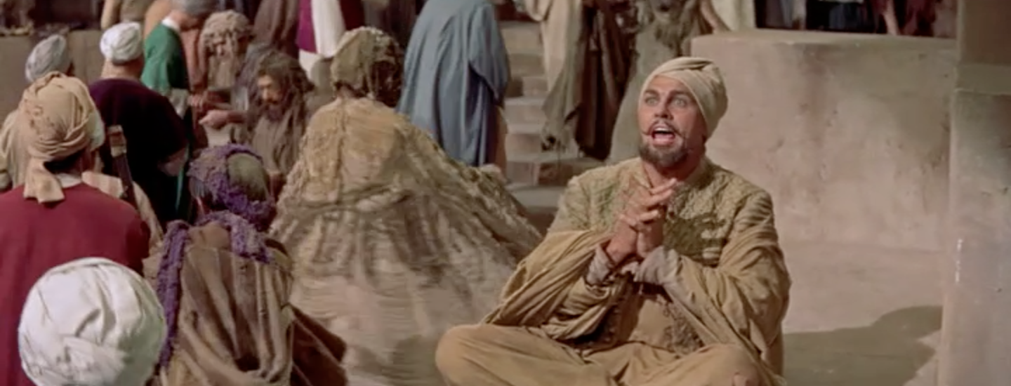 Framing note: Often in this movie the tops of heads or feet will be cut out of the frame. It seems that CinemaScope’s dimensions made it tricky for the filmmakers to keep what’s normally visible in frame. Once I noticed this, it was all I could see…everybody loses feet or turbans at some point.