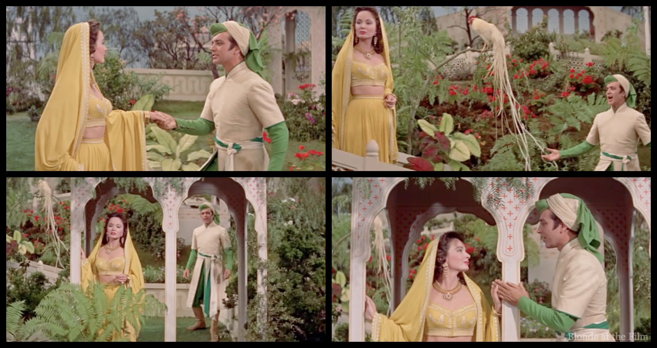 They stroll through the garden, passing random birds in a crazy-wide image that Minnelli stuffs with plants, structures, and flowers. And more birds.