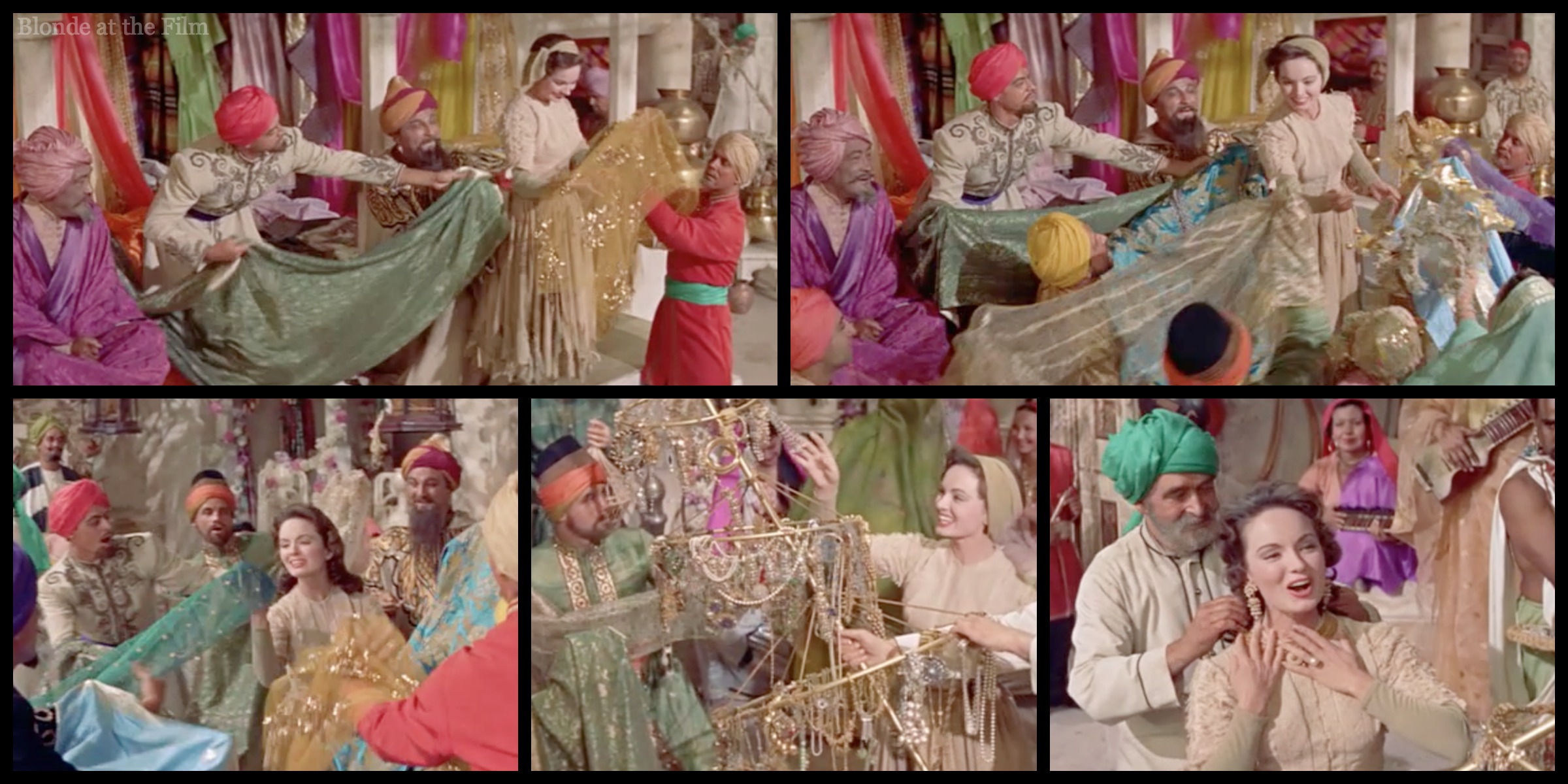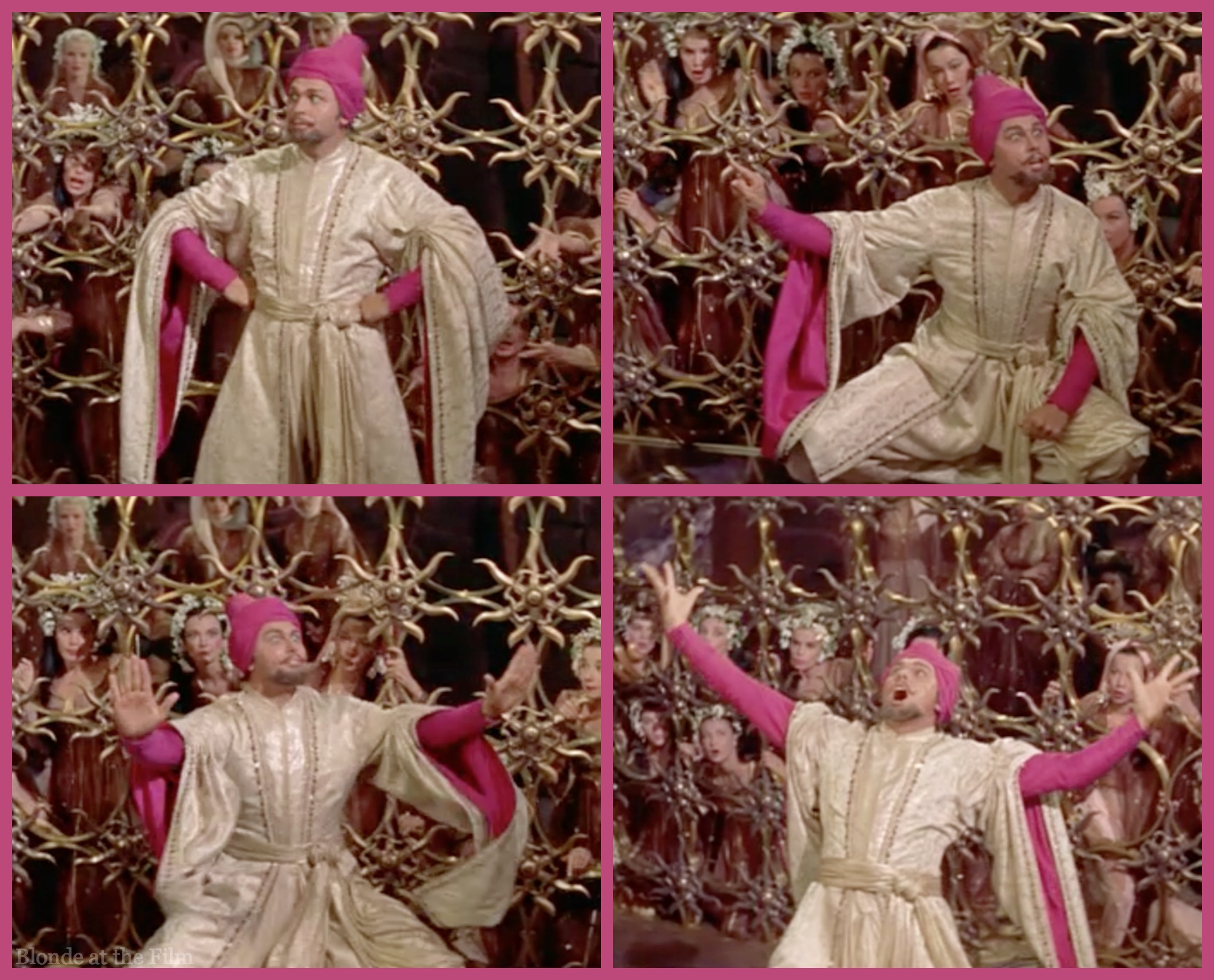 It doesn’t work. Obviously. So Marsinah goes off to steal some breakfast, as she often does. Note the whirling dervishes in the background of the last image. The wide, wide, wide CinemaScope frame allowed Minnelli to pack in loads of extras, color, movement, and sets.
