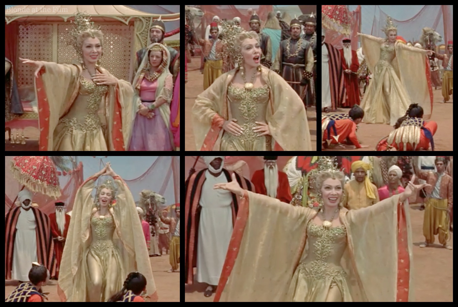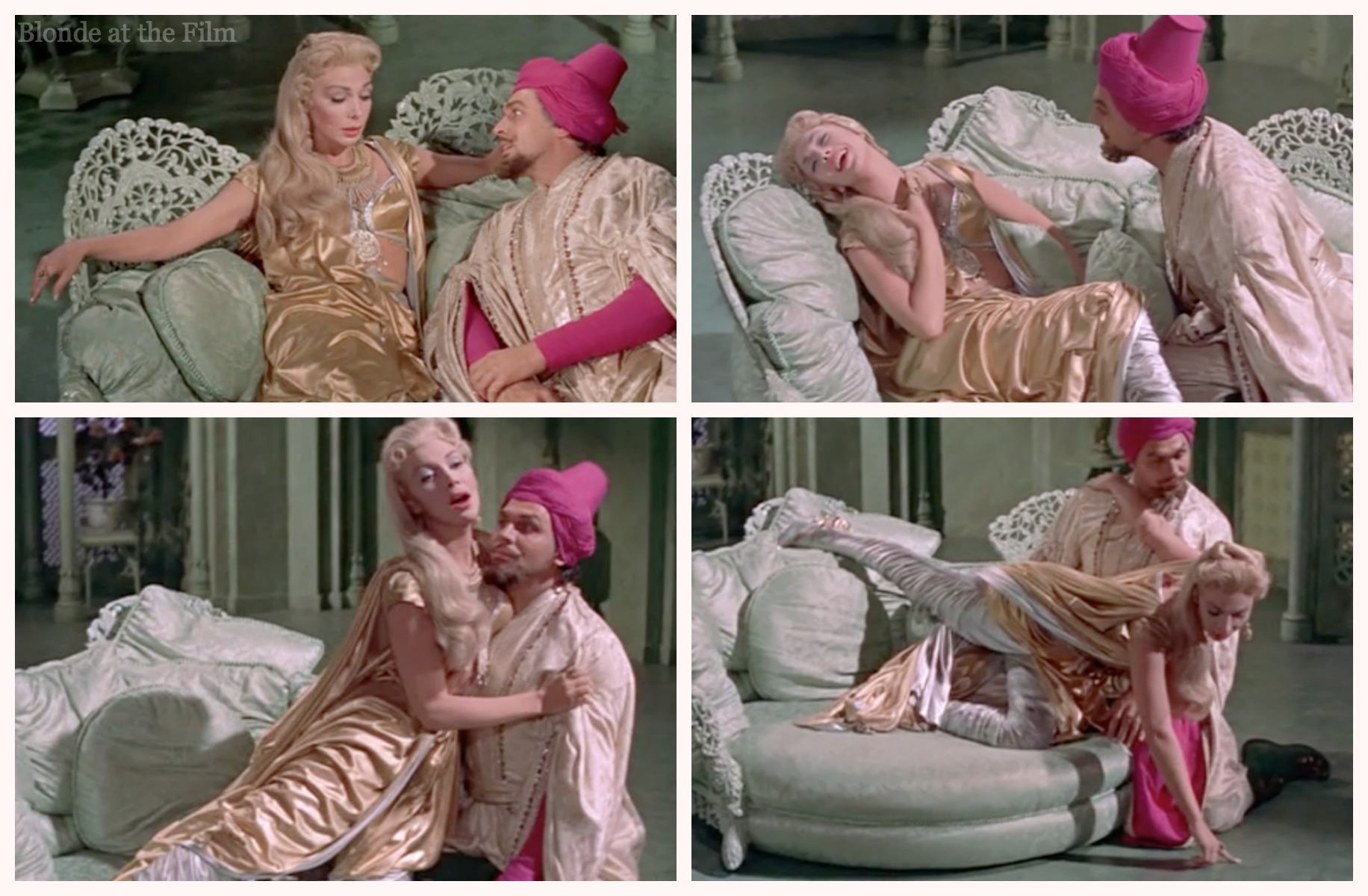 It’s clear fairly early that Lalume does not love, or even like, her husband. But she’s smart and powerful, and she can wear gold and sparkles like nobody else. (I’m not sure how many blondes in gold tights were wandering around ancient Baghdad, but no one ever claimed this movie was the least bit realistic. In any way.)