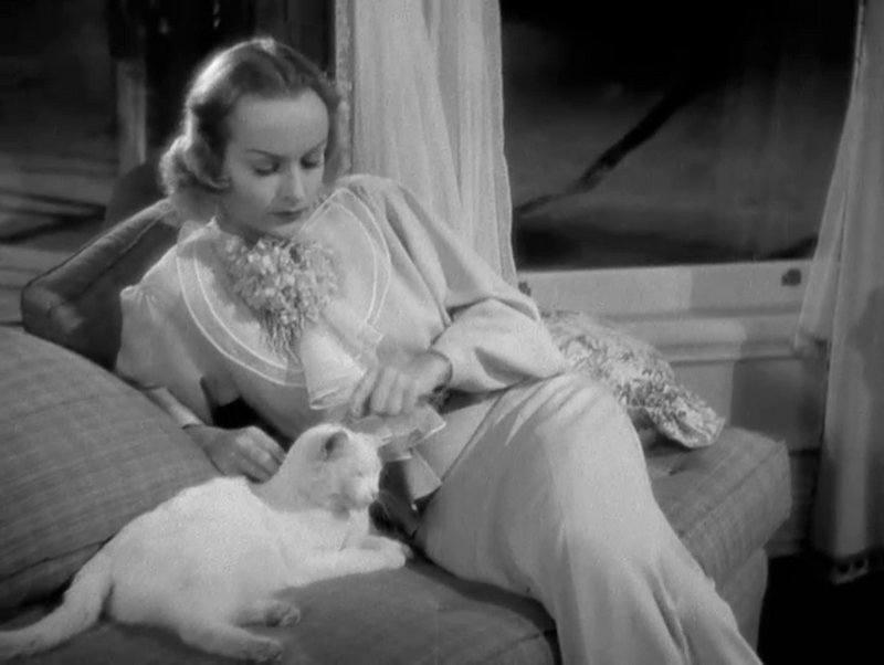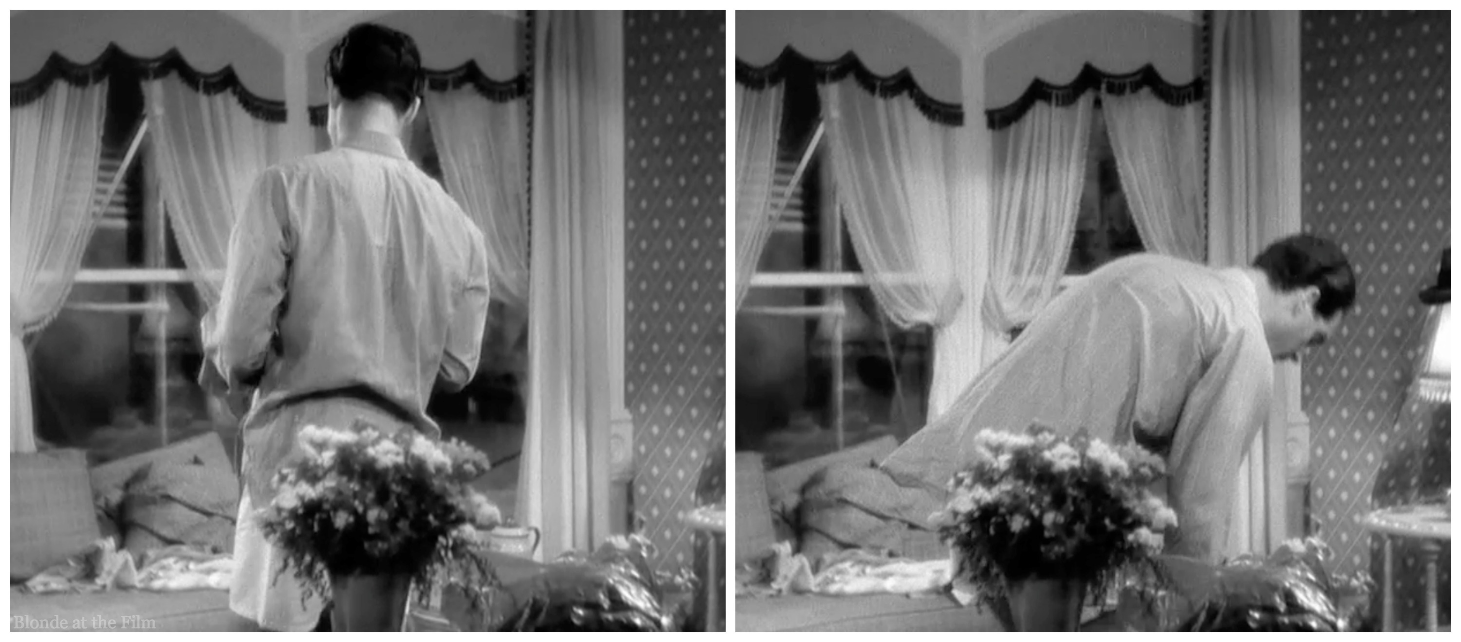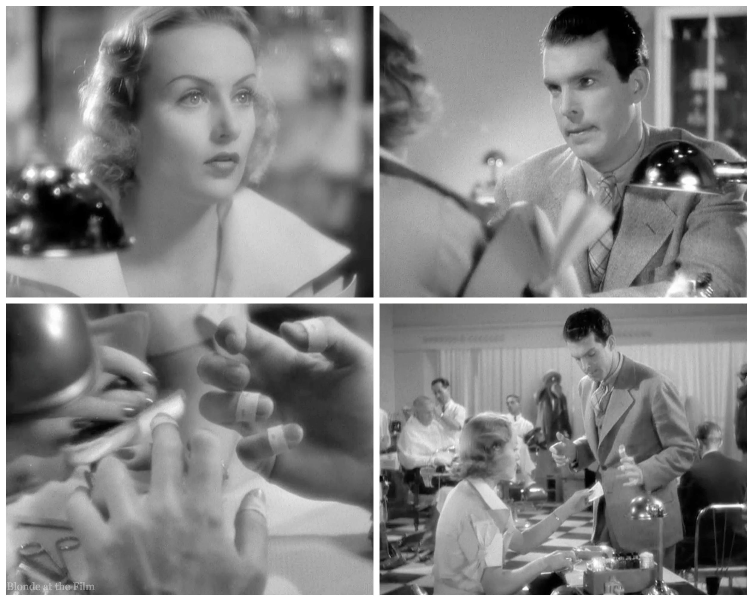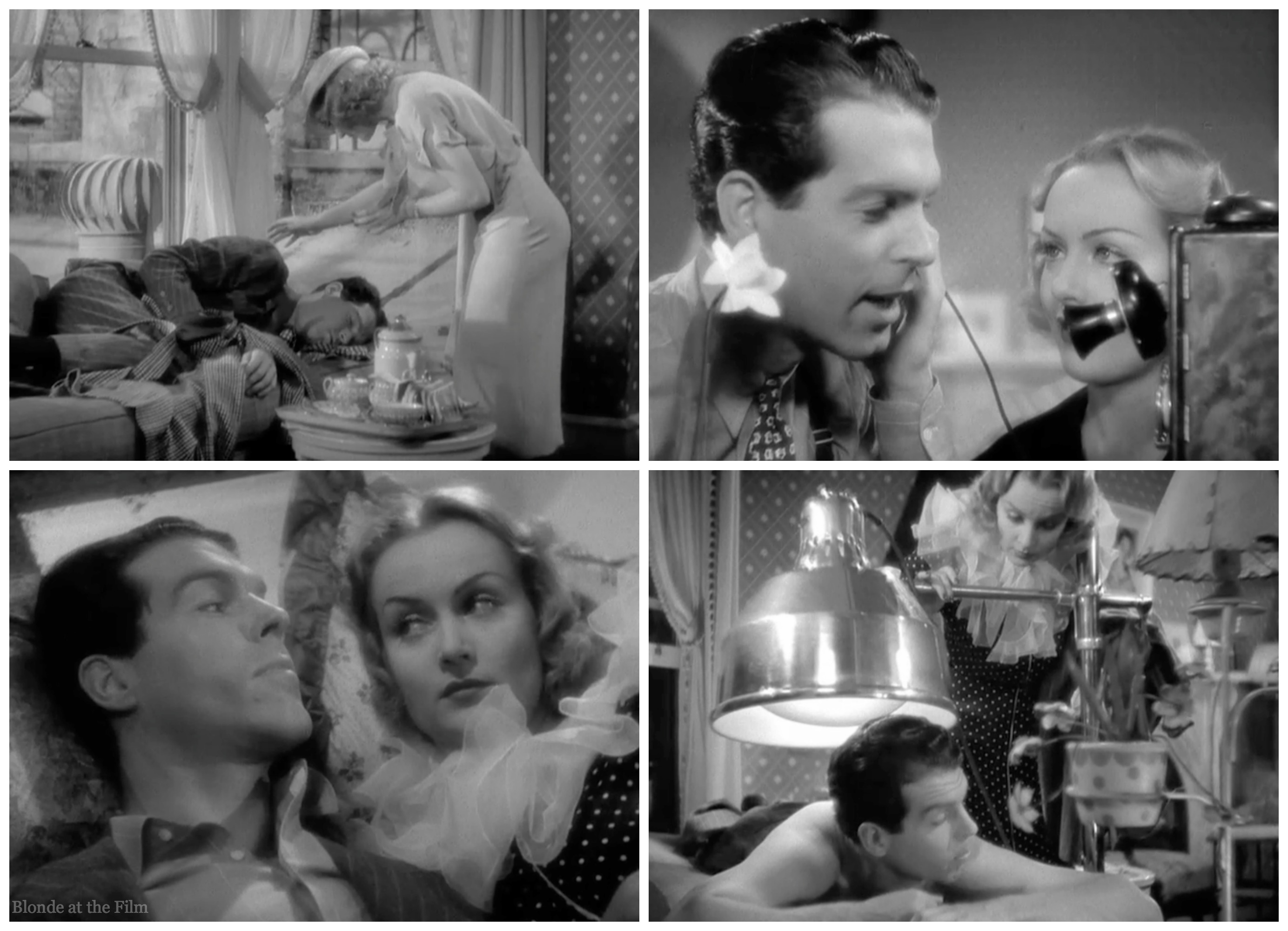The daffodil and telephone are in front of our stars when they’re calling from “Bermuda,” and the manicure lamp is foregrounded throughout that scene. This film was shot by Paramount cinematographer Ted Tetzlaff who often was assigned to Lombard’s films.