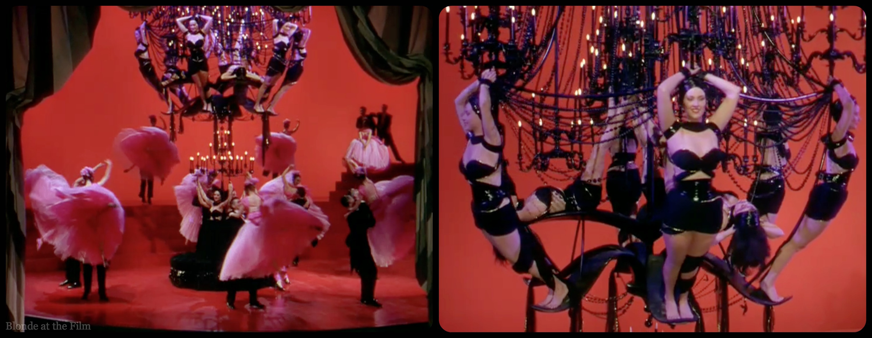 For example, the curtains open to reveal a red stage, stairs, and backdrop with men in tuxes dancing with women in huge pink dresses beneath a chandelier made out of scantily clad women. With a bondage theme?