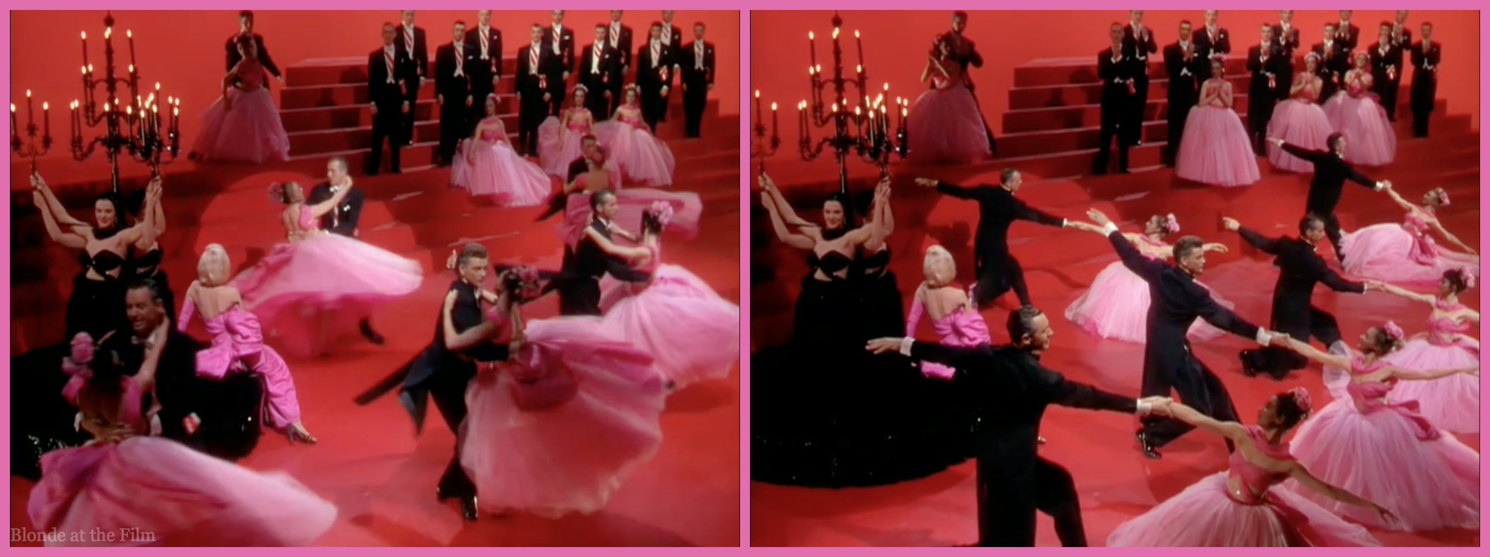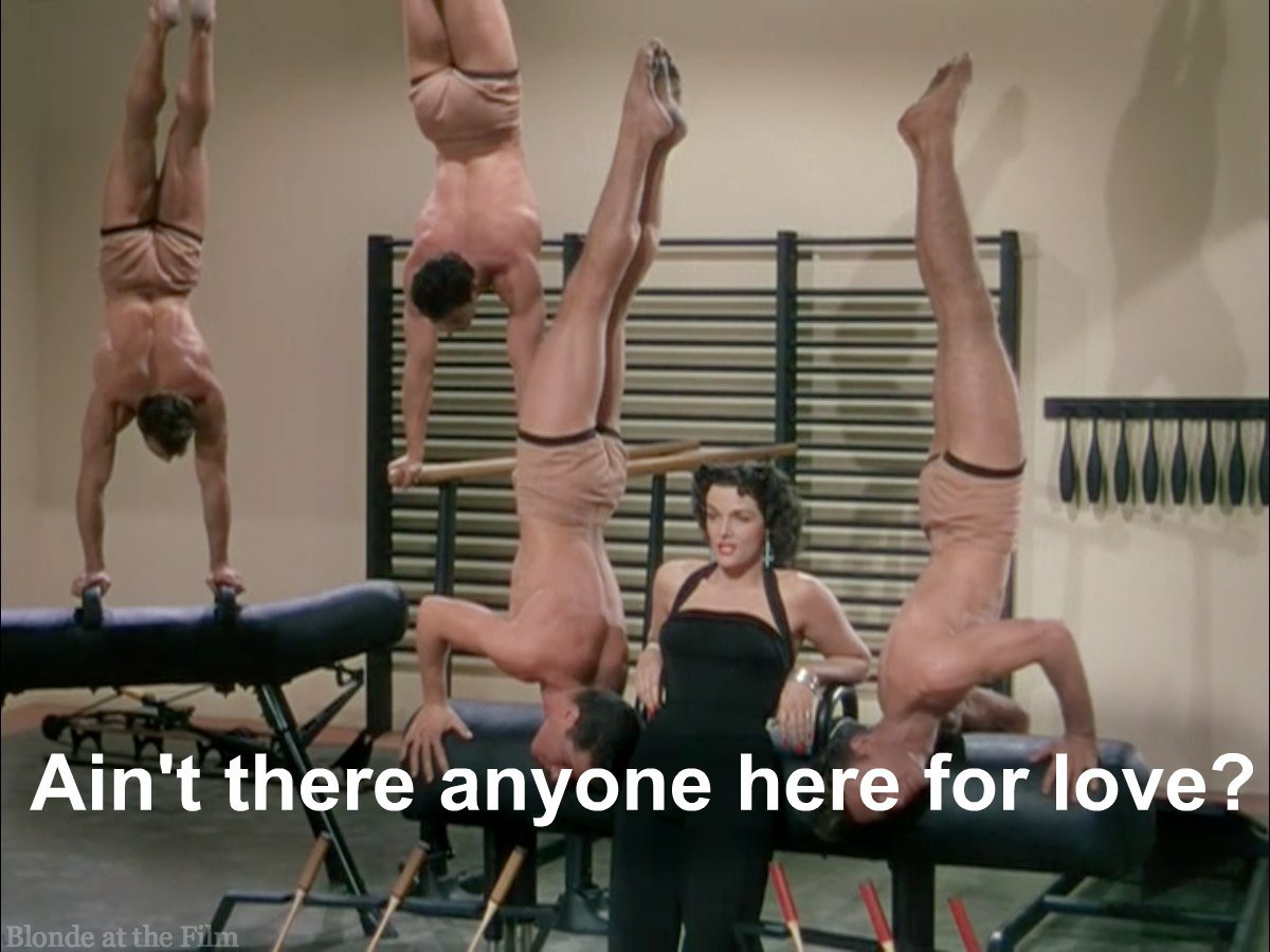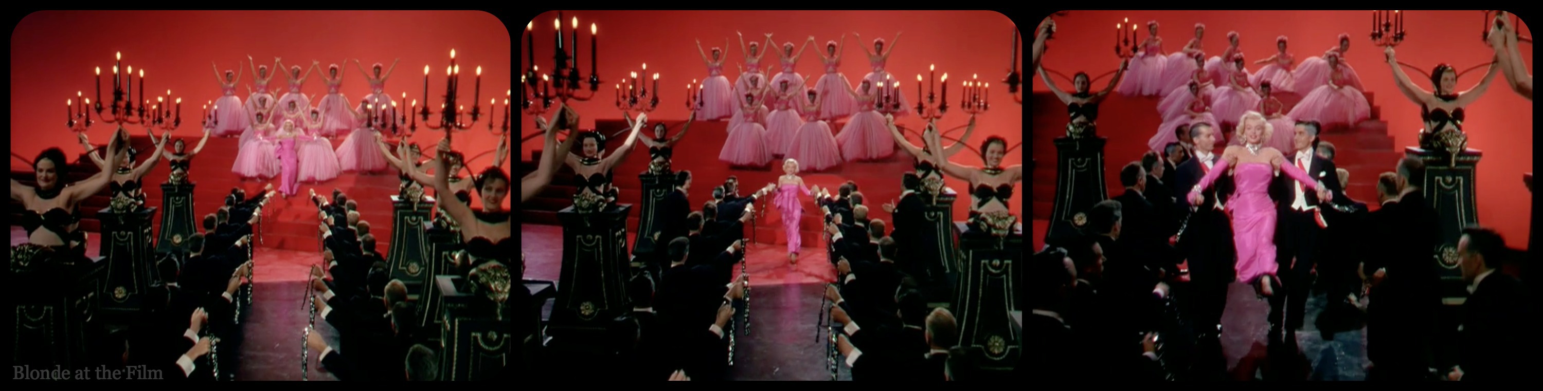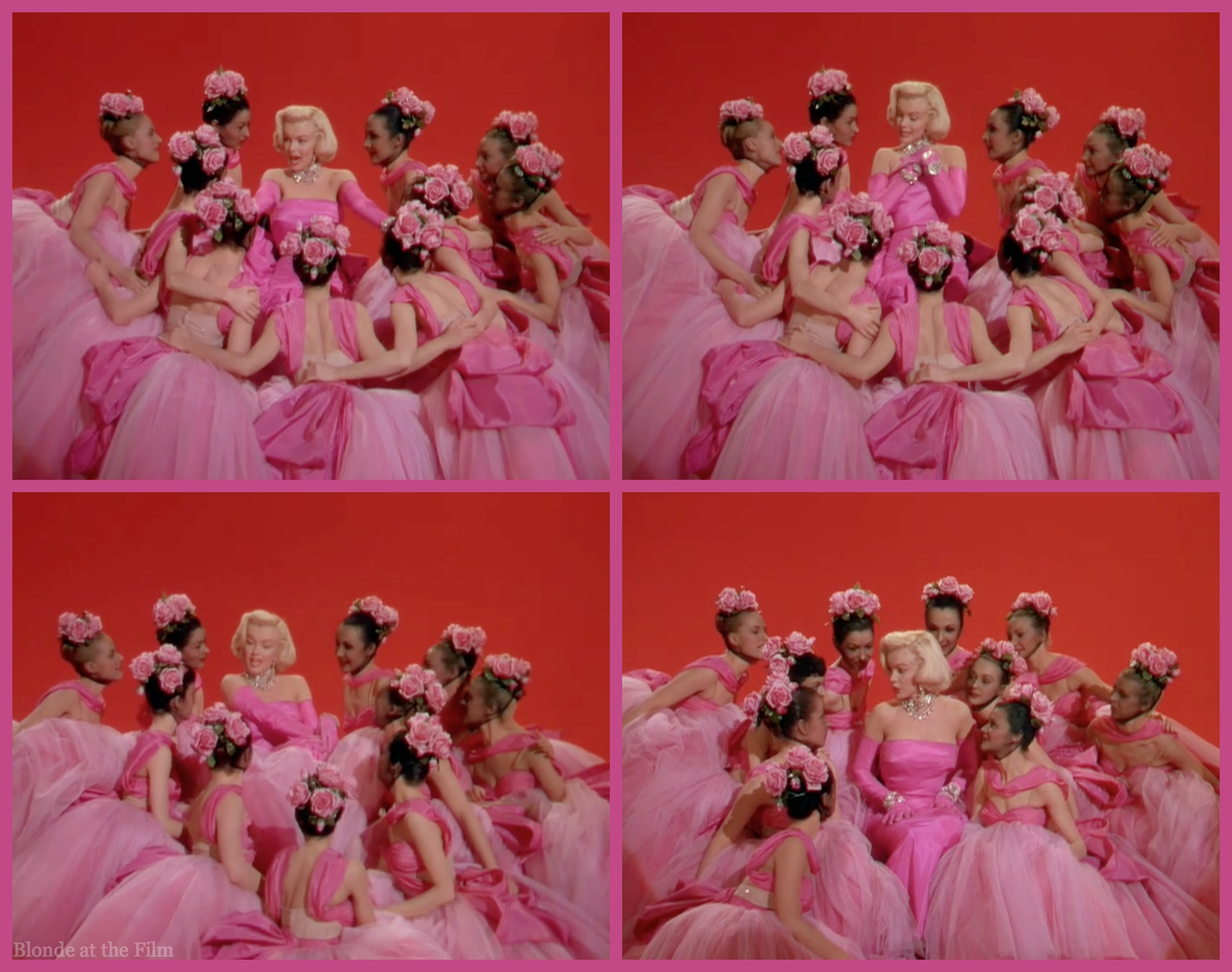 Marilyn sits with her back to the audience as pink skirts whirl around her, and the bondage ladies hold up the candelabra base of the chandelier. Jane Russell got to cavort with a bunch of nearly naked men; now it’s Marilyn Monroe’s turn to go wild.
