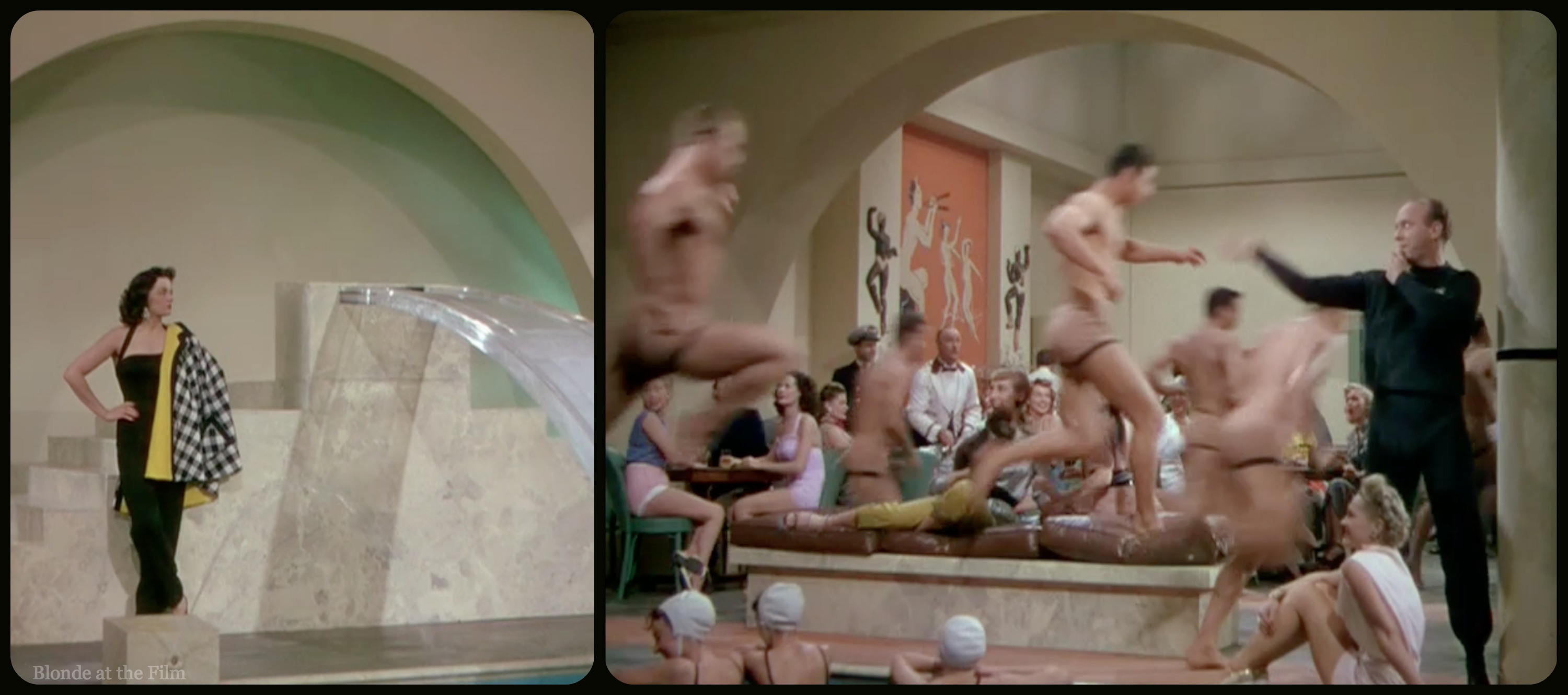 Once the athletes have performed enough wacky calisthenics and gymnastic feats, the athletes dive over Dorothy into the pool. But one of them accidentally clipped Jane Russell as he launched himself into the water: