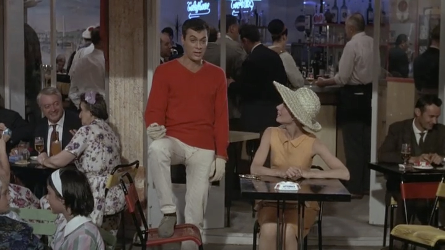 Anyway, in Richard’s script, the Tony Curtis character cancels the date with Gabby (he’s got a role in a Roger Roussan-New Wave film called “No Dancing in The Streets” about a Bastille Day when it rains…)  You can watch it here.
