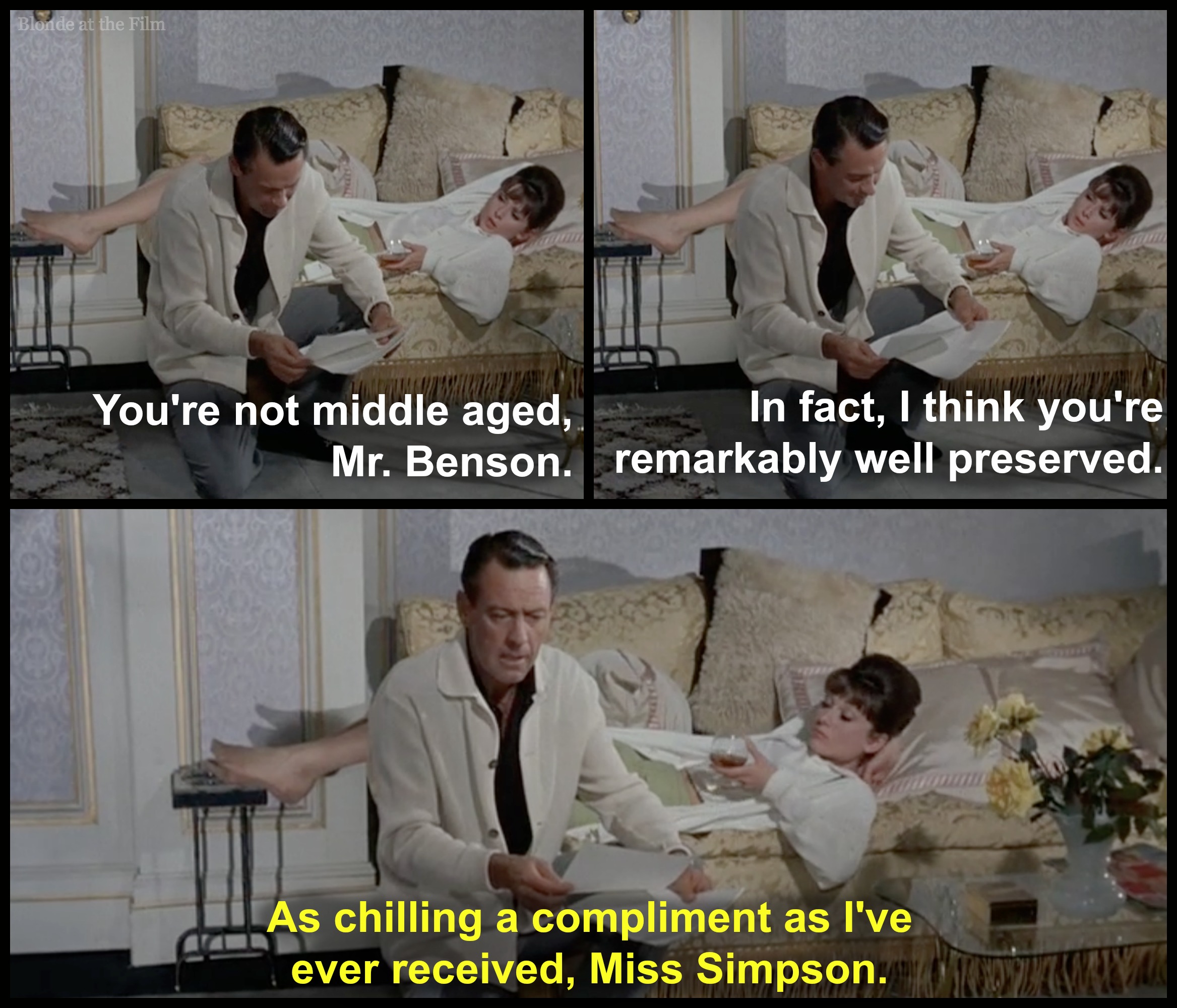 Audrey Hepburn is Gabrielle Simpson, a secretary, who is sent in to type up Benson’s  new script a few days before his producer is due to arrive in Paris.