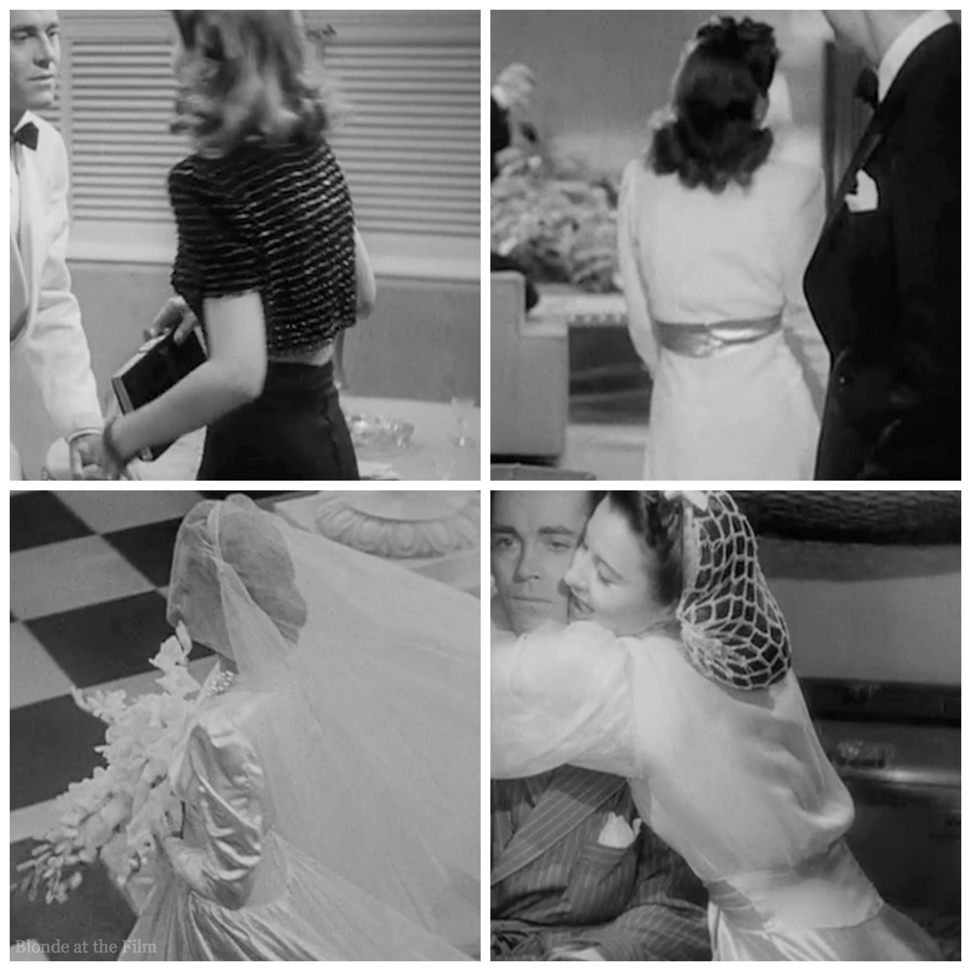 Head described in Edith Head’s Hollywood how she solved Stanwyck’s “problem:” “By widening the waistbands on the front of her gowns and narrowing them slightly in the back, I could still put her in straight skirts, something other designers were afraid to do, because they thought she might look too heavy in the seat. Since she wasn’t the least bit heavy, I just took advantage of her long waist to create an optical illusion that her derriere was just as pertly placed as any other star’s” (43). None of the waistbands are cut straight across, and you can see Head made the waistbands dip in the back to make Stanwyck’s rear end seem higher.