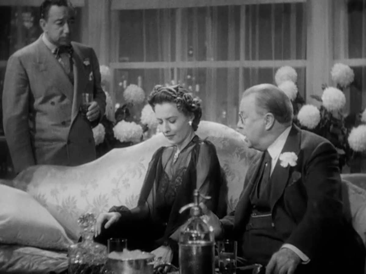 Eve is the life of the party: charming, amusing, beautiful. Mr. Pike is especially taken with her. That’s Hopsi’s mom with them on the left (Janet Beecher). No one notices Muggsy skulking outside, watching Eve. So no one notices Muggsy fall off the window ledge into the shrubbery.