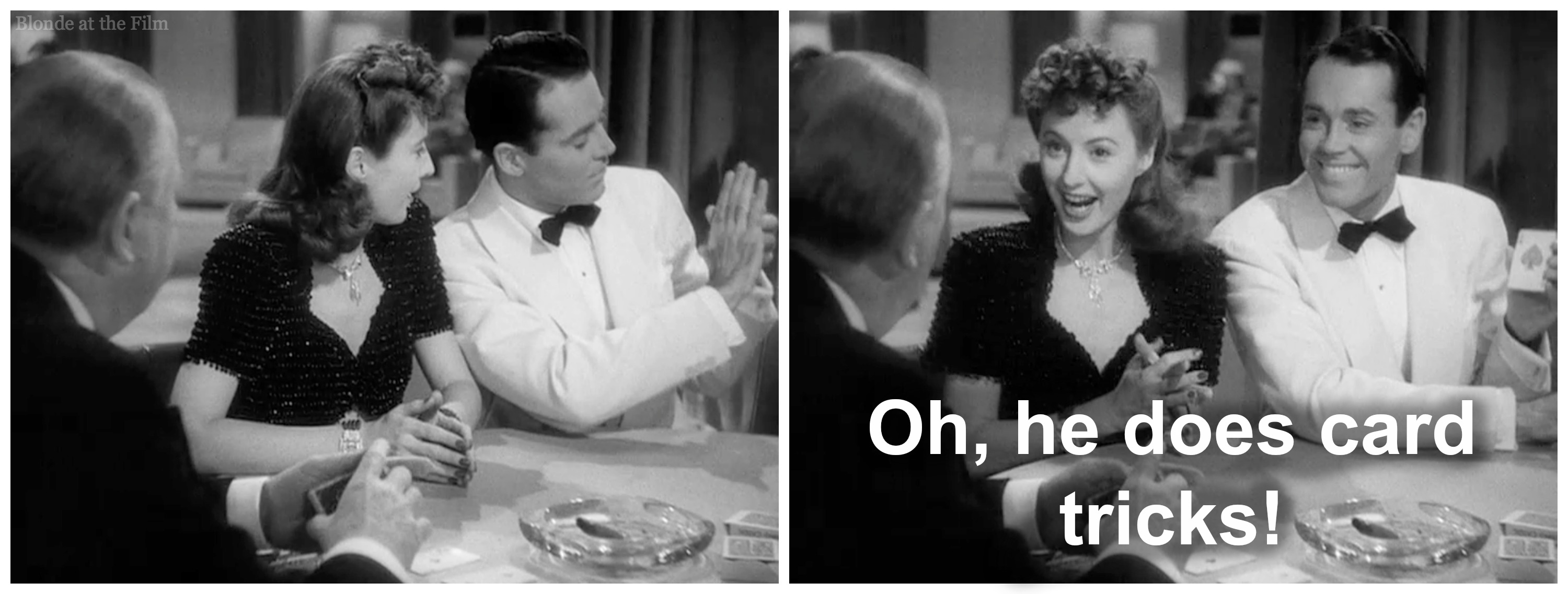 Stanwyck is wonderful in this scene. She’s completely in control, playing with Hopsi as part of the con, but enjoying herself, too. This is no fat old sucker stepping on her feet in the moonlight! And Hopsi has no idea what’s happening! The scene passes the 1940s censor-proof decency code, but it doesn’t feel at all old-fashioned. That’s Sturges’ genius. It reminds me of the dress-unbuttonings in The Palm Beach Story. Both scenes have sexual-tension for days wrapped in a classy, sophisticated package.