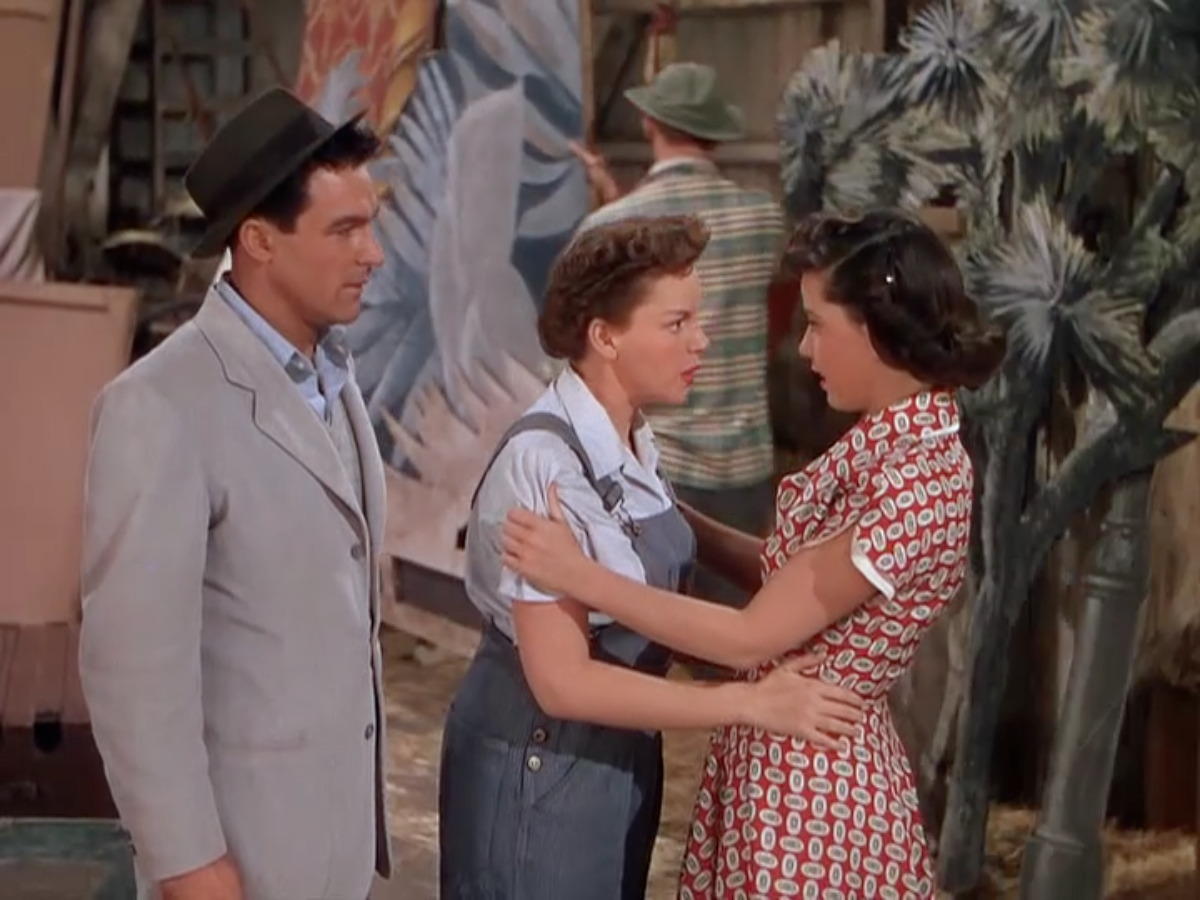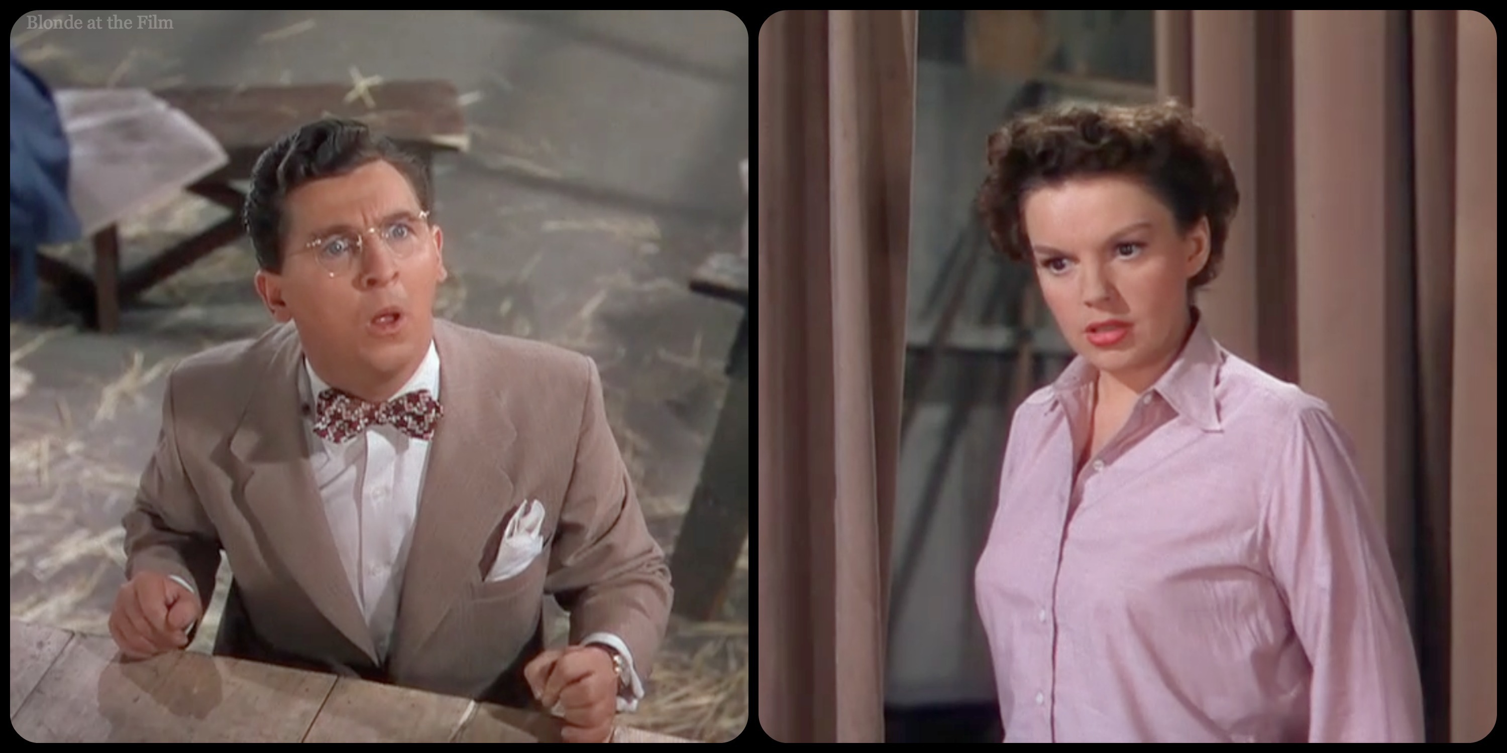 Back to Summer Stock. This is a fun scene, and it starts a trend that continues throughout the movie. Even if you had no idea about the story or the characters, the costumes tell you everything you need to know. Joe and Jane match! It’s like they’re wearing the same pale blue shirt and they’re both in casual, muted tones. Now look at how differently Abigail is dressed in a fancy, bright, shiny, patterned frock. She doesn’t go with Joe at all.
