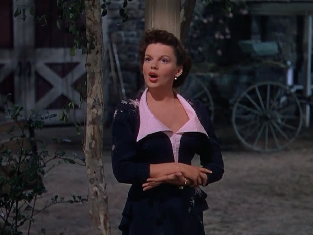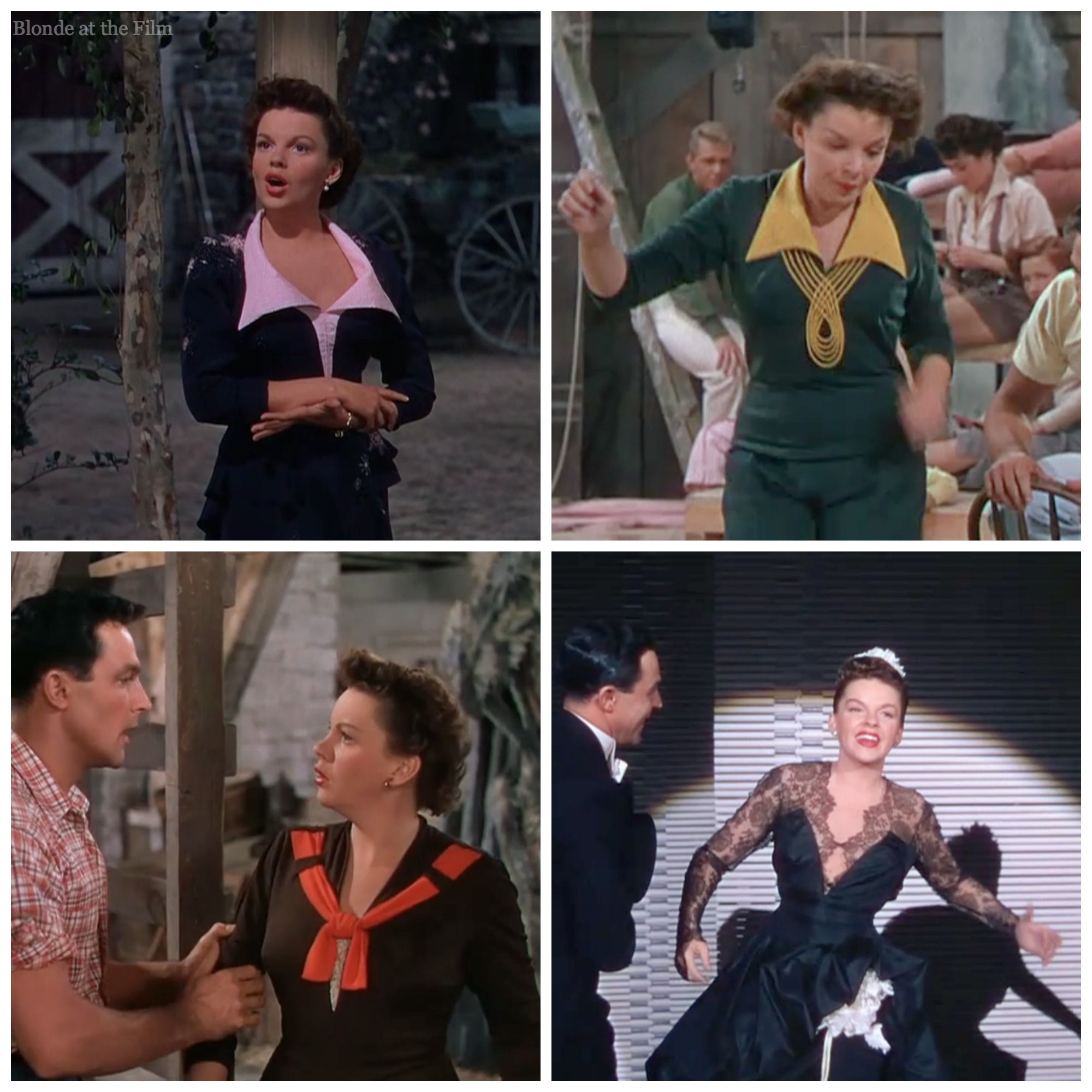 Walter Plunkett designed Garland’s costumes for this movie, and remembered how tricky it was: “We tried to make her look as thin as possible, but we weren’t miracle workers, and we didn’t succeed.” He did try some interesting strategies, mainly elaborate collars and details around the bust line to draw attention up towards her face: