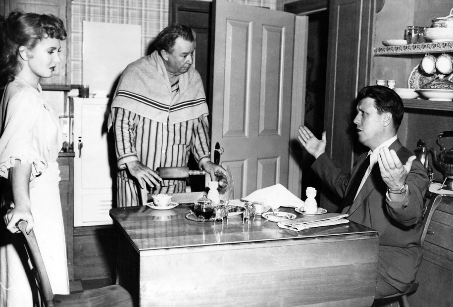 It takes a few seconds for the encounter to sink in: Connie slides to a stop in her mules, and Joe does a wonderful spit-take before both return to the hallway. An unabashed Joe gives Connie the old up-and-down. It’s not totally fair, because Connie is cold-creamed and braided and house-coated, whereas Joe looks as handsome as ever.