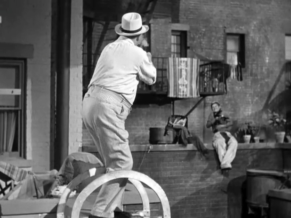 And because the pants joke is too good to let go, when Dingle follows Joe into the hallway, his suspenders catch on the doorknob, and the pants go sailing out of his hands and onto the window box.