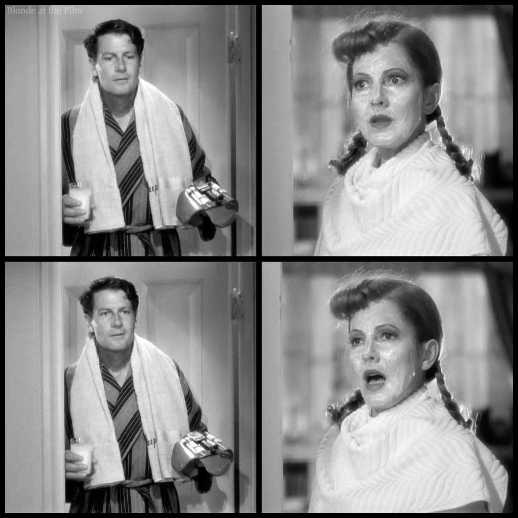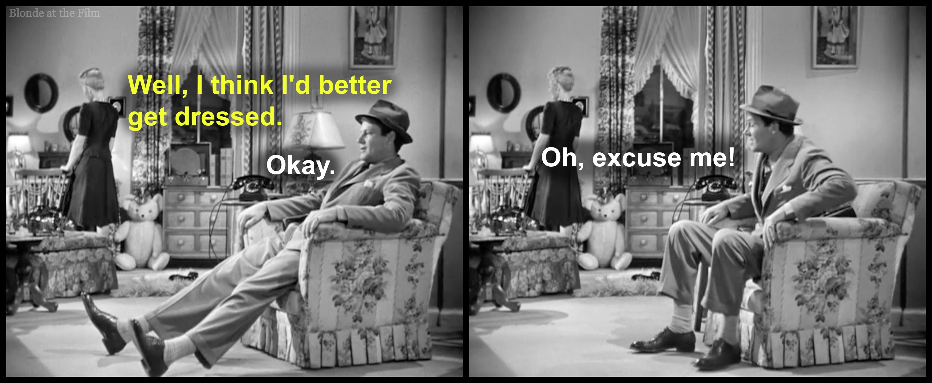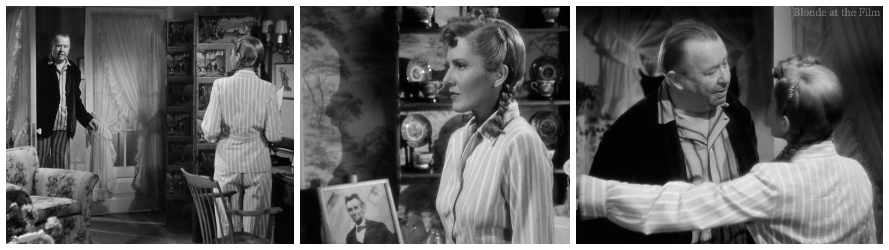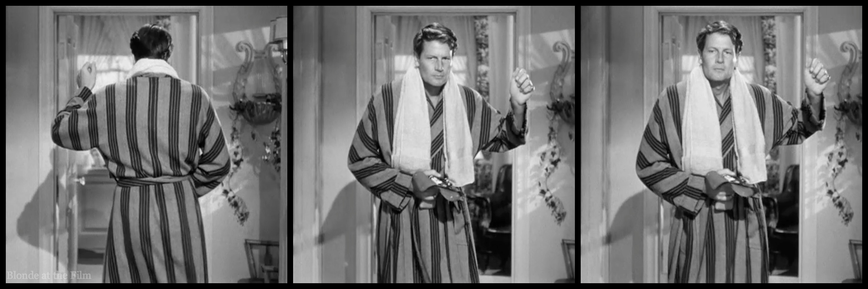Amidst all the exits and entrances, there’s a dance break. Connie turns on some music and begins a casual rhumba in her bedroom. Joe hears it and begins his own dance in the hallway. It’s one of my favorite moments; not only is it funny to watch these two adults practicing their dance moves, especially Joe in his bathrobe clutching his shaving gear, but how adorable is it to have our two leads dancing “together” before they even meet? You know they’re perfect for each other–it’s Old Hollywood code!