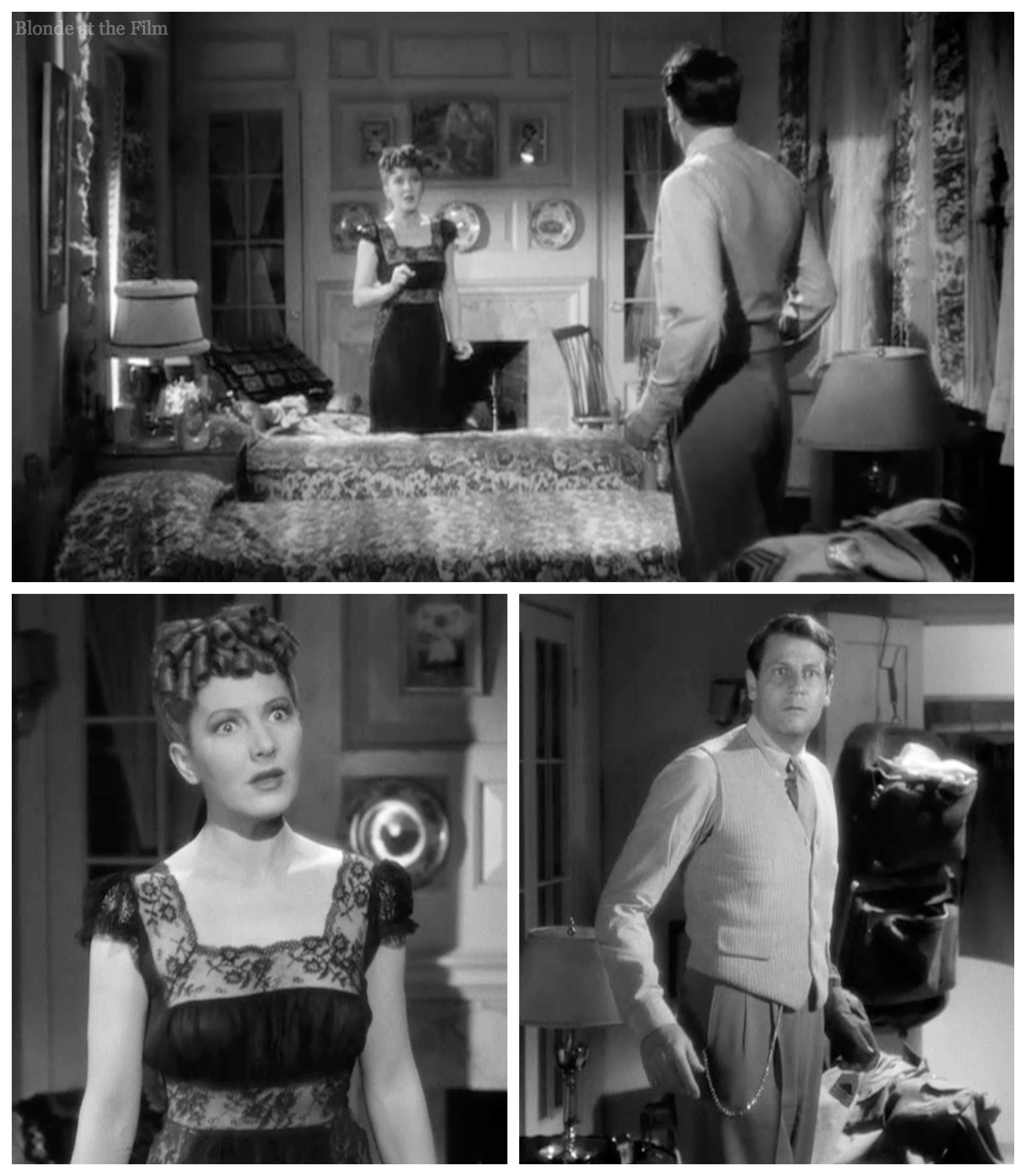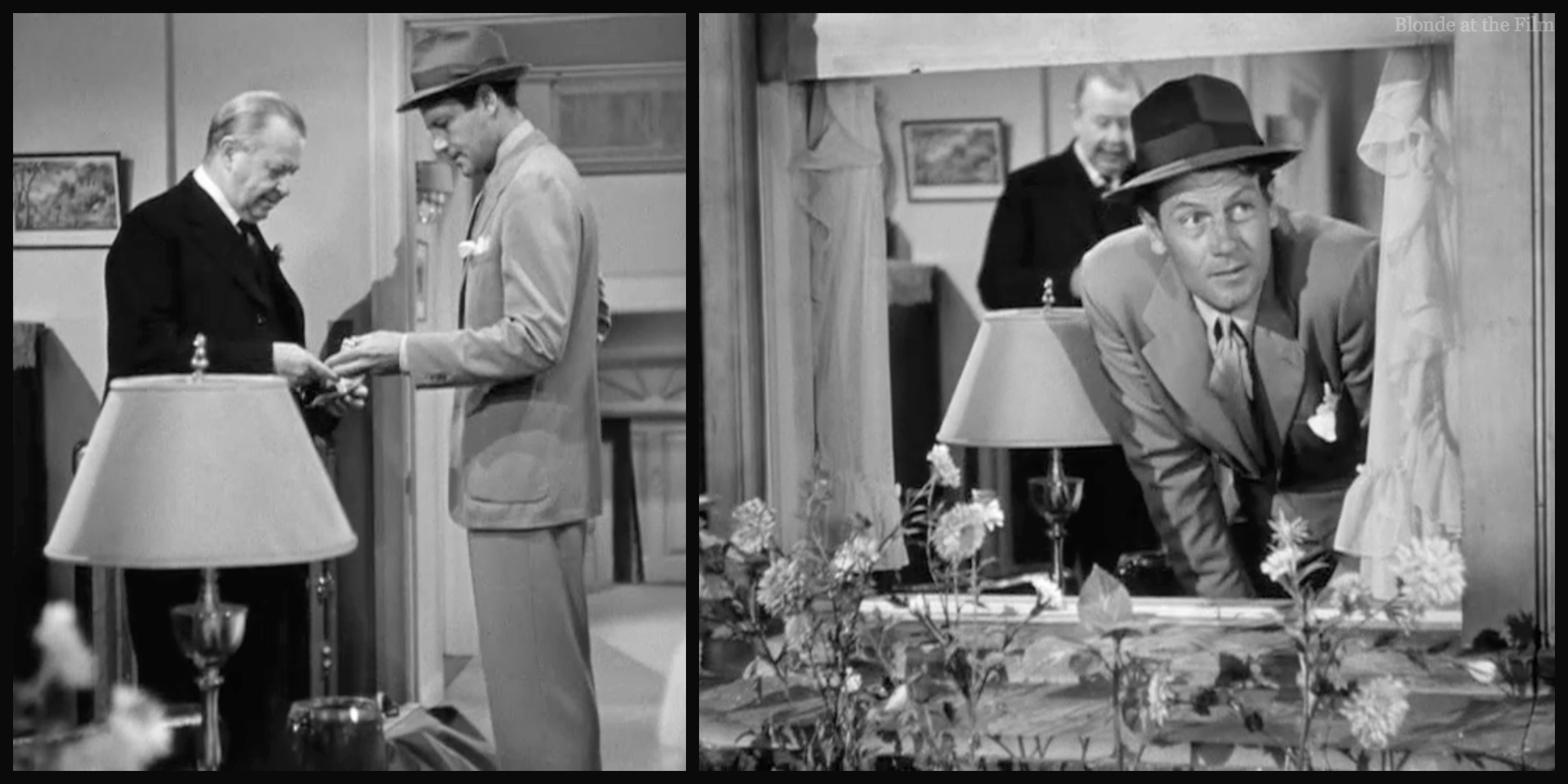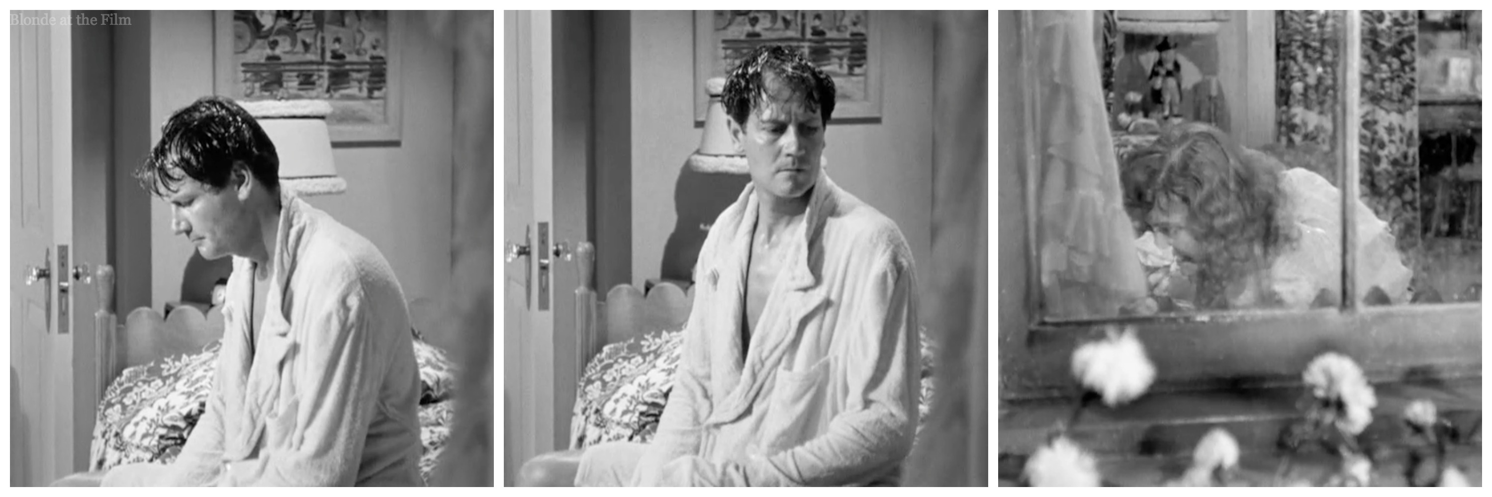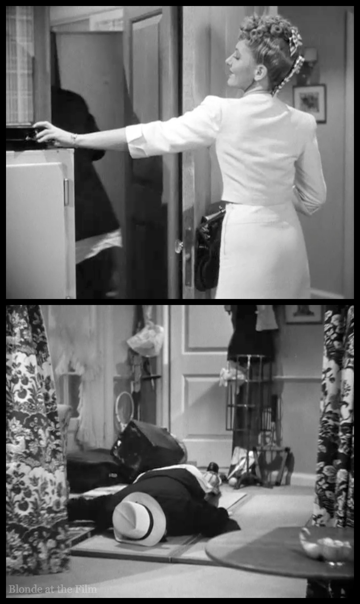 Amidst all the exits and entrances, there’s a dance break. Connie turns on some music and begins a casual rhumba in her bedroom. Joe hears it and begins his own dance in the hallway. It’s one of my favorite moments; not only is it funny to watch these two adults practicing their dance moves, especially Joe in his bathrobe clutching his shaving gear, but how adorable is it to have our two leads dancing “together” before they even meet? You know they’re perfect for each other–it’s Old Hollywood code!