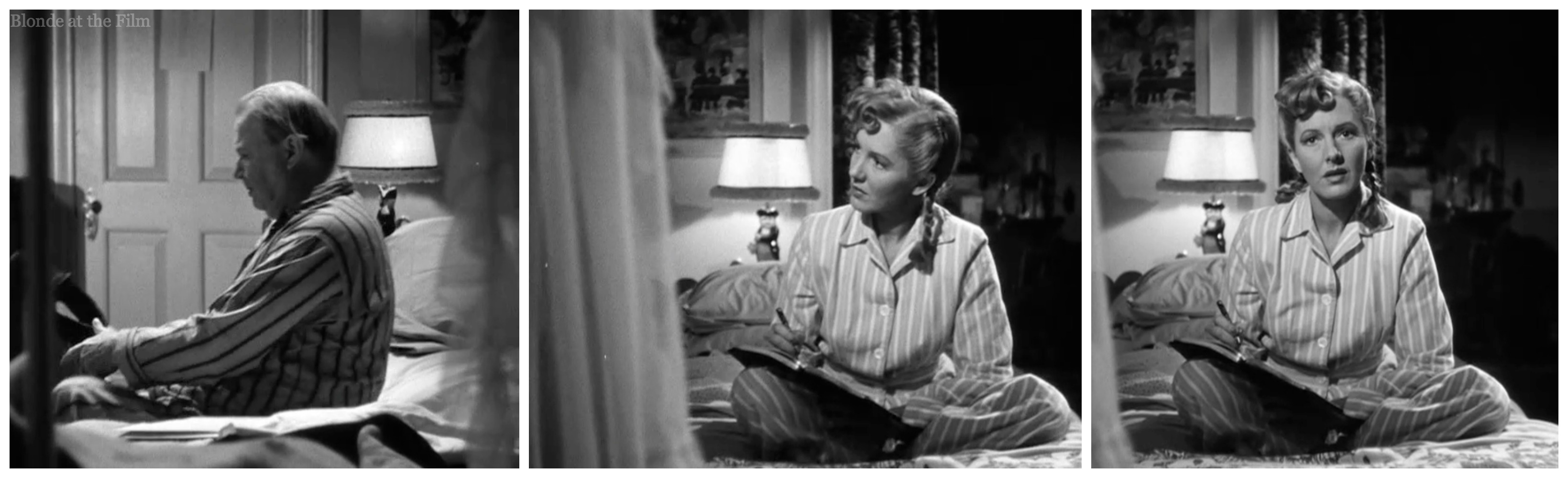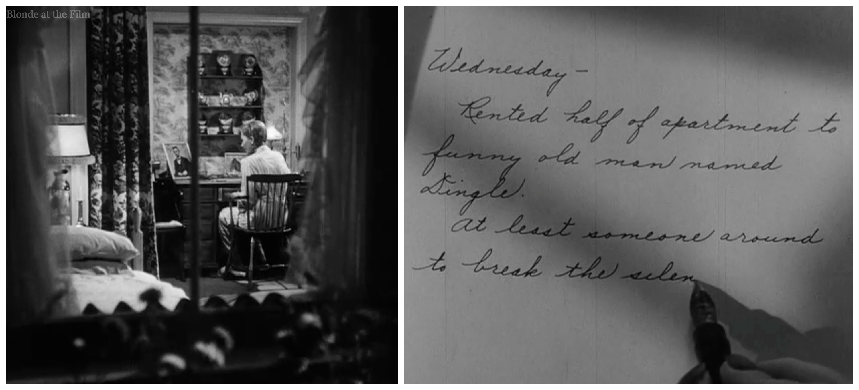 Fun fact: it’s not Jean Arthur’s hand we see scribbling in the diary. There were people whose job it was to be the “hand”–they have lovely penmanship, of course! Here’s the woman writing Connie’s diary entries with the camera over her right shoulder, and lights in front and to the side.