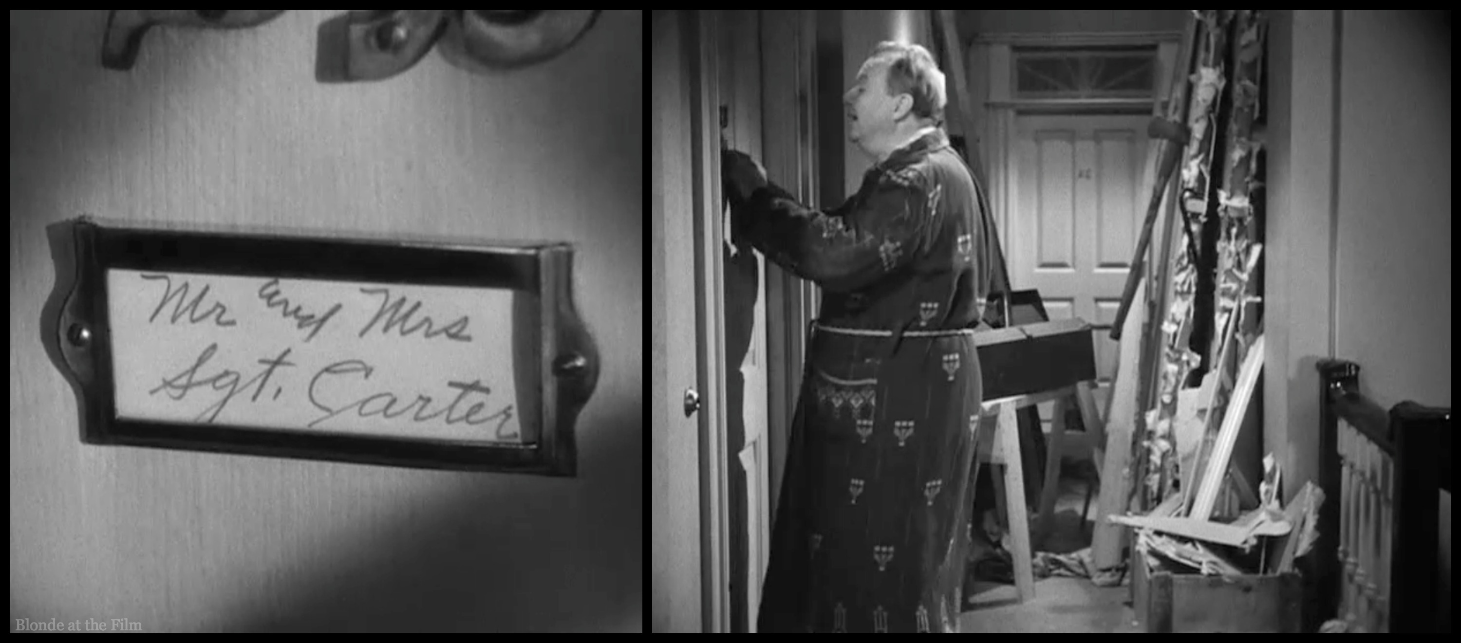 Anyway, Connie doesn’t know that she is now living with two men–one of whom is young, single, and amazing. And Joe has no idea about Connie. Once all three arrive home from work, Dingle has quite the screwball situation on his hands trying to keep Joe and Connie away from each other in this tiny apartment. Dingle is barely able to erase Joe’s handwritten “Carter” from the label on the door before Connie sees it: