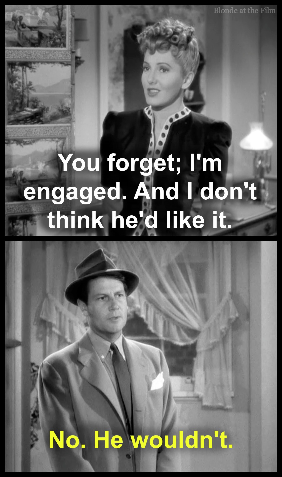 This is basically a perfect movie in my mind – the cast, the dialogue, the physicality of it all, the chemistry! Charles Coburn certainly deserved that Oscar, if only for that coffee scene and the deadpan delivery of that line: “There’s a war going on, Miss Millgan.” Though the dialogue is great, it’s physical scenes like those (and that infamous front stoop sequence, which is probably one of the sexiest in Hollywood history) that really make this film stand out for me. Thanks for sharing this!