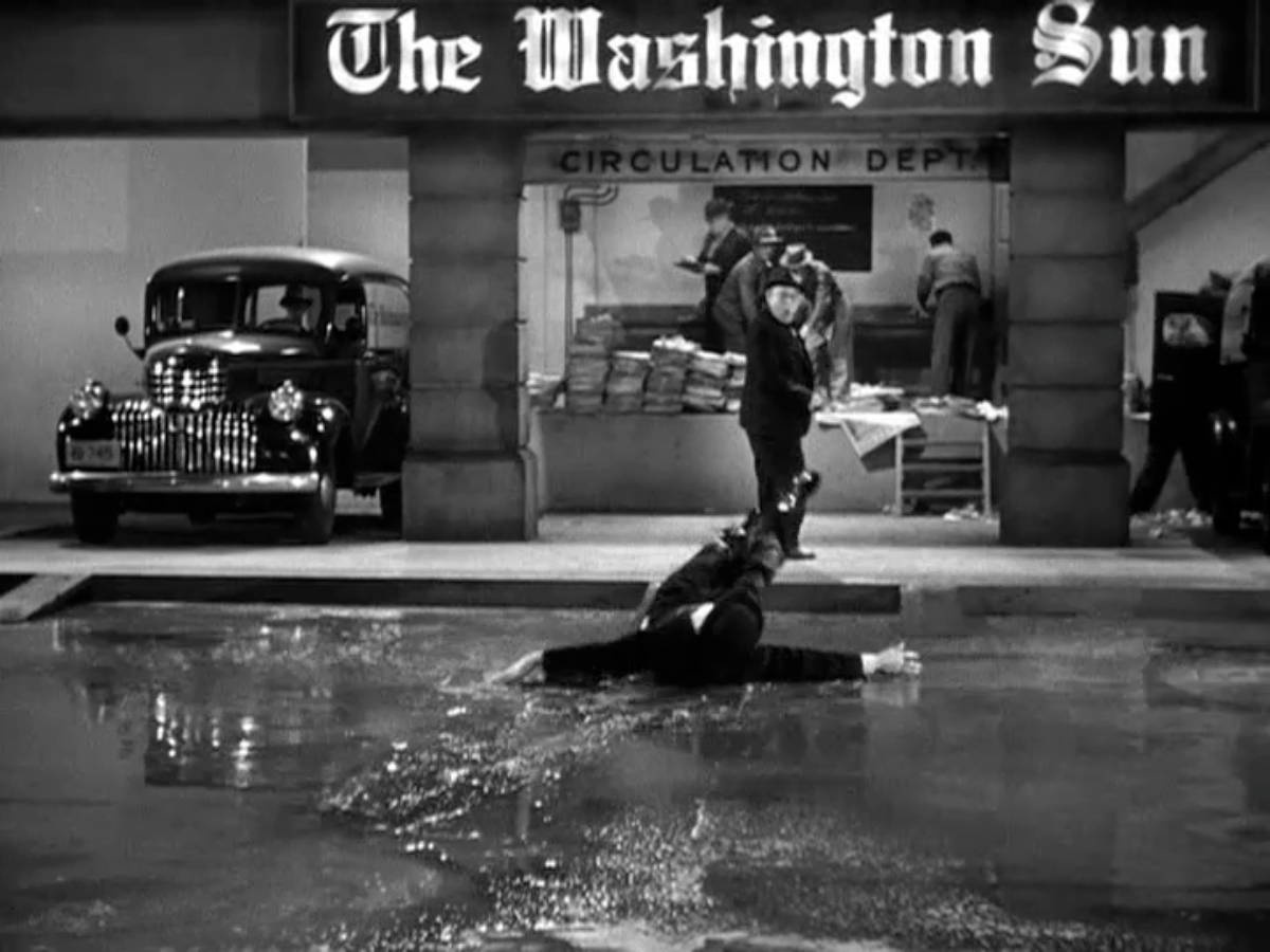 What the group doesn’t realize is that the little man in the corner is a reporter. He gets the whole story, and poor Pendergast does a spectacular prat fall chasing after him: