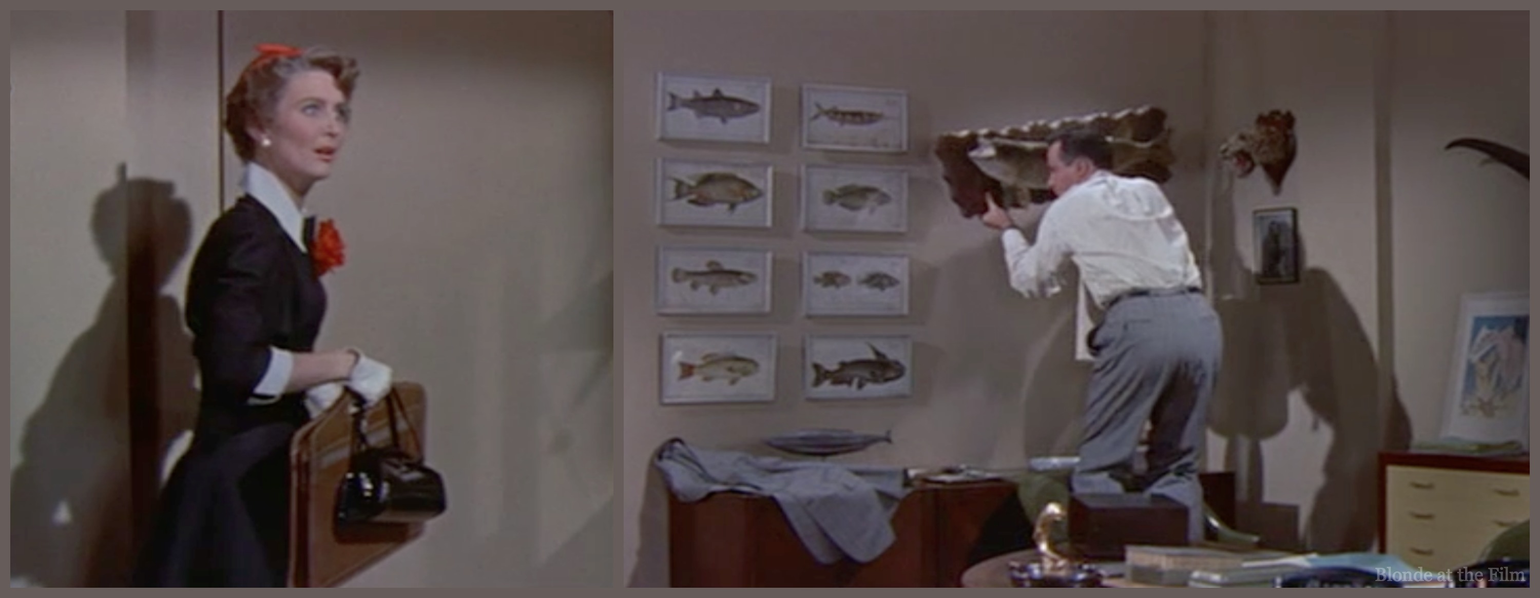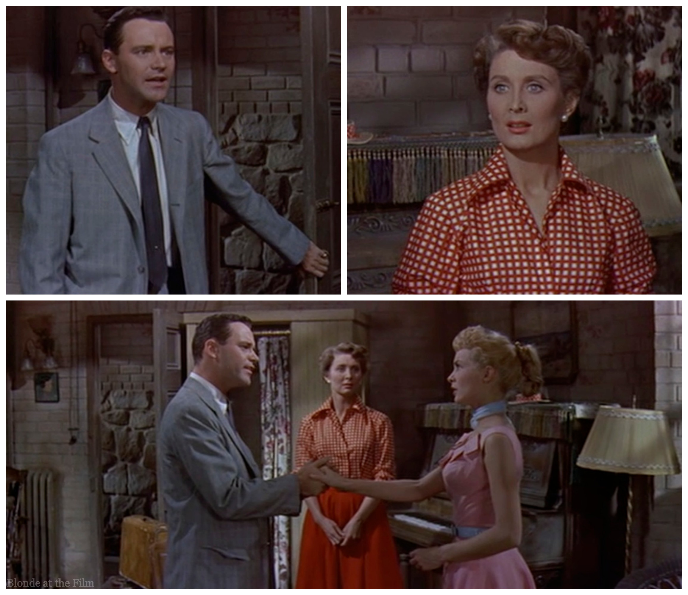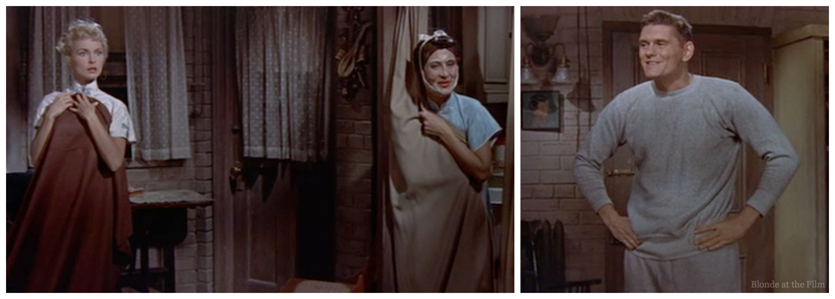 Columbia’s costume designer Jean Louis (the designer of Rita Hayworth‘s black strapless dress in Gilda, and the shimmering gown that Marilyn Monroe wore when she sang Happy Birthday to JFK) designed the costumes for this film, and it’s a really fascinating exercise in contrast. Eileen and Ruth are almost always dressed in coordinating but contrasting outfits. Notice how Eileen’s jammies are white with pale blue trim but Ruth’s are pale blue with white trim? Watch for similar touches throughout the movie.