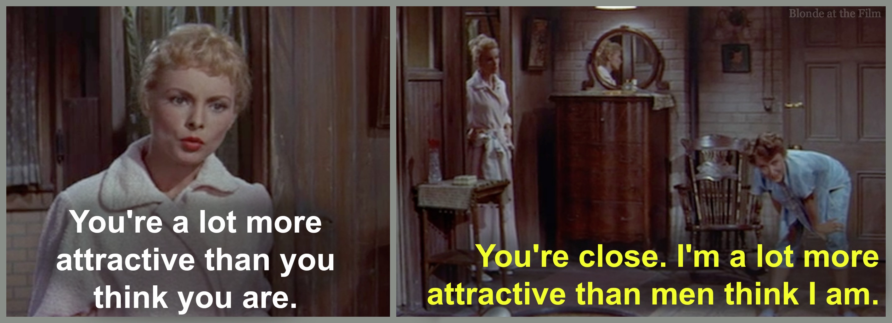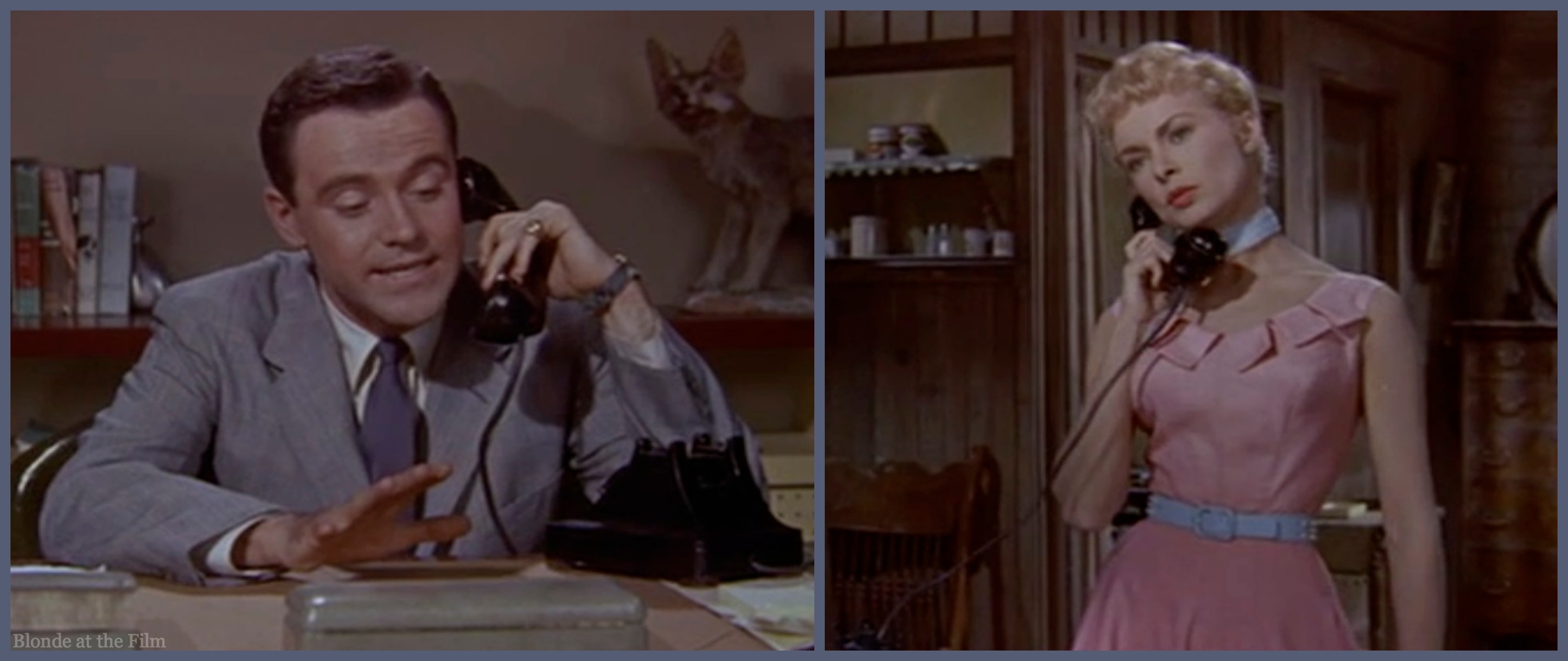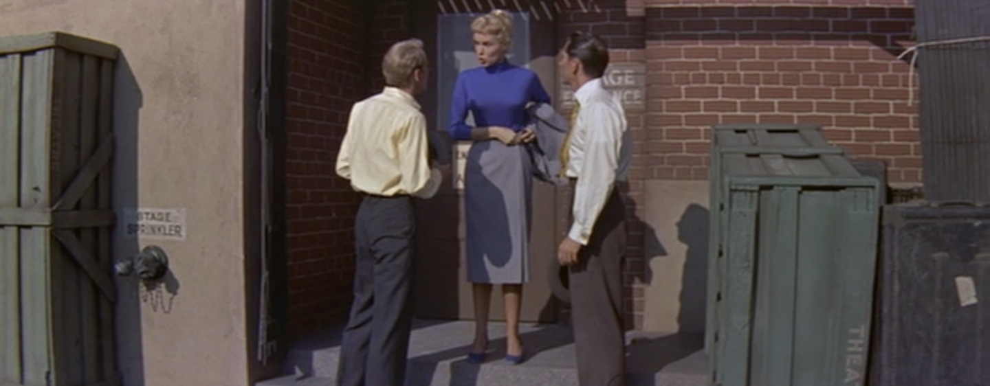 Columbia’s costume designer Jean Louis (the designer of Rita Hayworth‘s black strapless dress in Gilda, and the shimmering gown that Marilyn Monroe wore when she sang Happy Birthday to JFK) designed the costumes for this film, and it’s a really fascinating exercise in contrast. Eileen and Ruth are almost always dressed in coordinating but contrasting outfits. Notice how Eileen’s jammies are white with pale blue trim but Ruth’s are pale blue with white trim? Watch for similar touches throughout the movie.