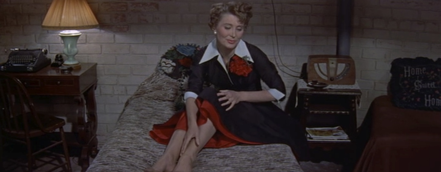 Fun fact: Eileen’s first foray into the world of acting is a fun example of Jean Louis dressing Eileen as a very good girl. Her baby pink outfit with big buttons, a wide collar, and a swingy skirt is innocent and girlish, and don’t forget that polka dot bow in her hair!  This sweet pink confection helps echo and reinforce Eileen’s surprised naiveté at the casting couch policy, and helps the audience know that she definitely did not succumb. How could she, in such an innocent rosy outfit? Imagine how it would change things if Eileen had worn a tight black dress or a sexy red number, perhaps with a matching veiled hat instead of a pink dot hair bow?