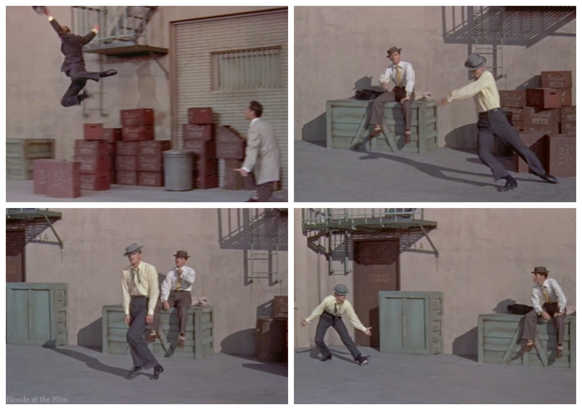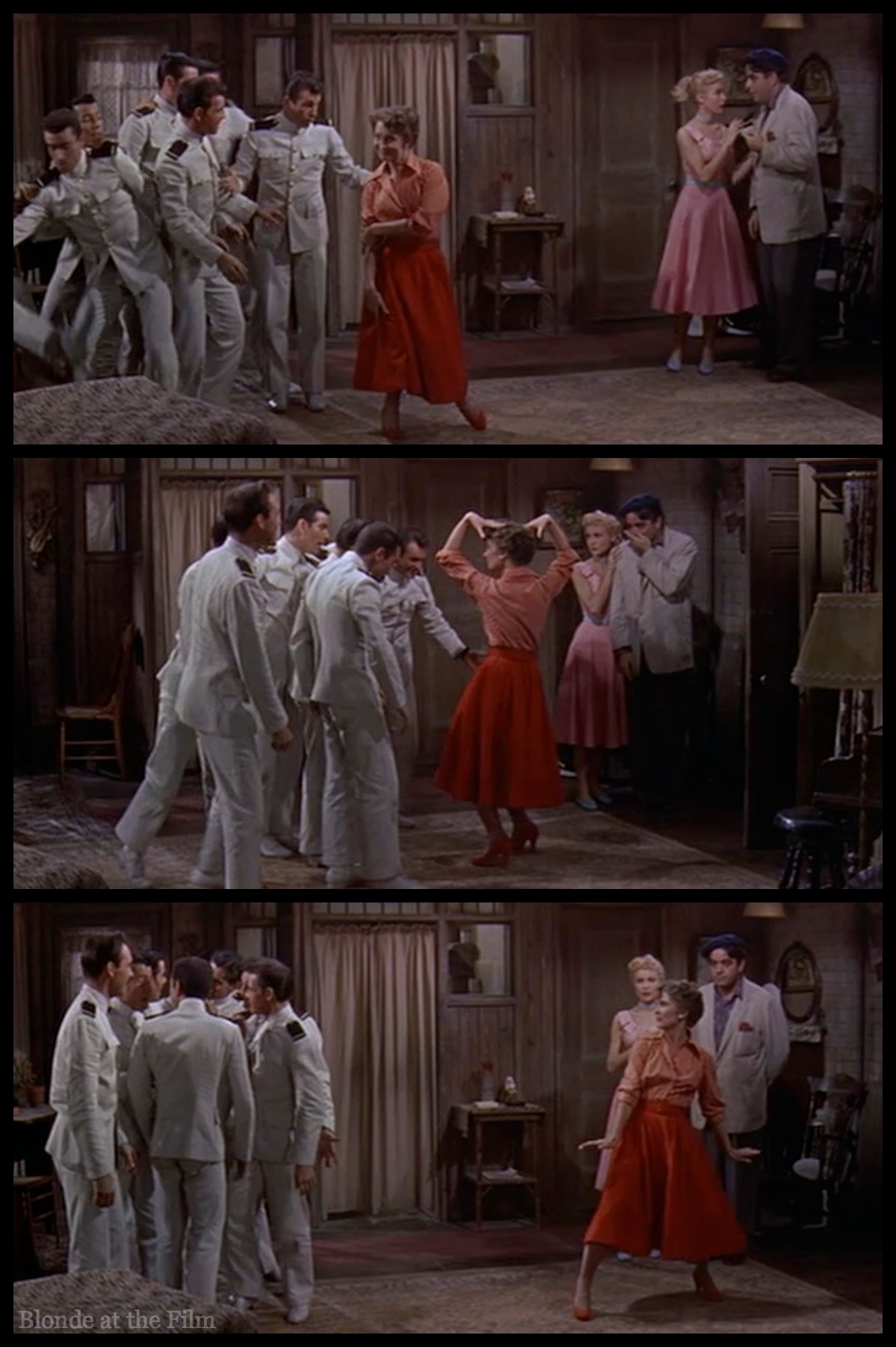 Eileen is thrilled, and the man in the brown hat is intrigued…it’s Chick Clark, a newspaper reporter. Chick is played by Tommy Rall, one of the greatest dancers ever. He’s spectacular–you may have seen him in Seven Brides for Seven Brothers as Frank, or in Kiss Me Kate as Bill/Lucentio. He can spin like a top, jump like a jackrabbit, flip, leap, shuffle, and tap dance with the best of them. He just skims the ground, and makes gravity seems optional.