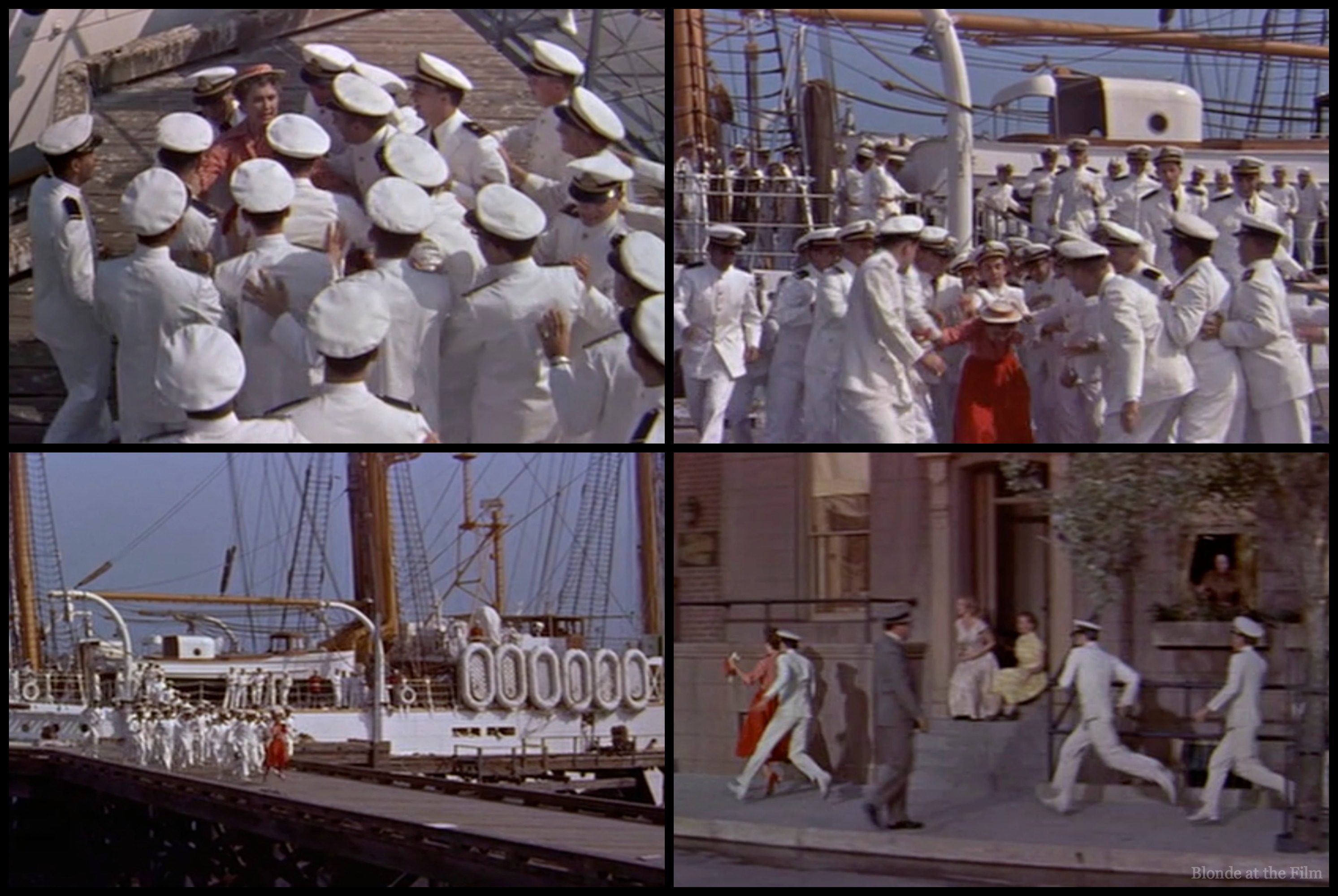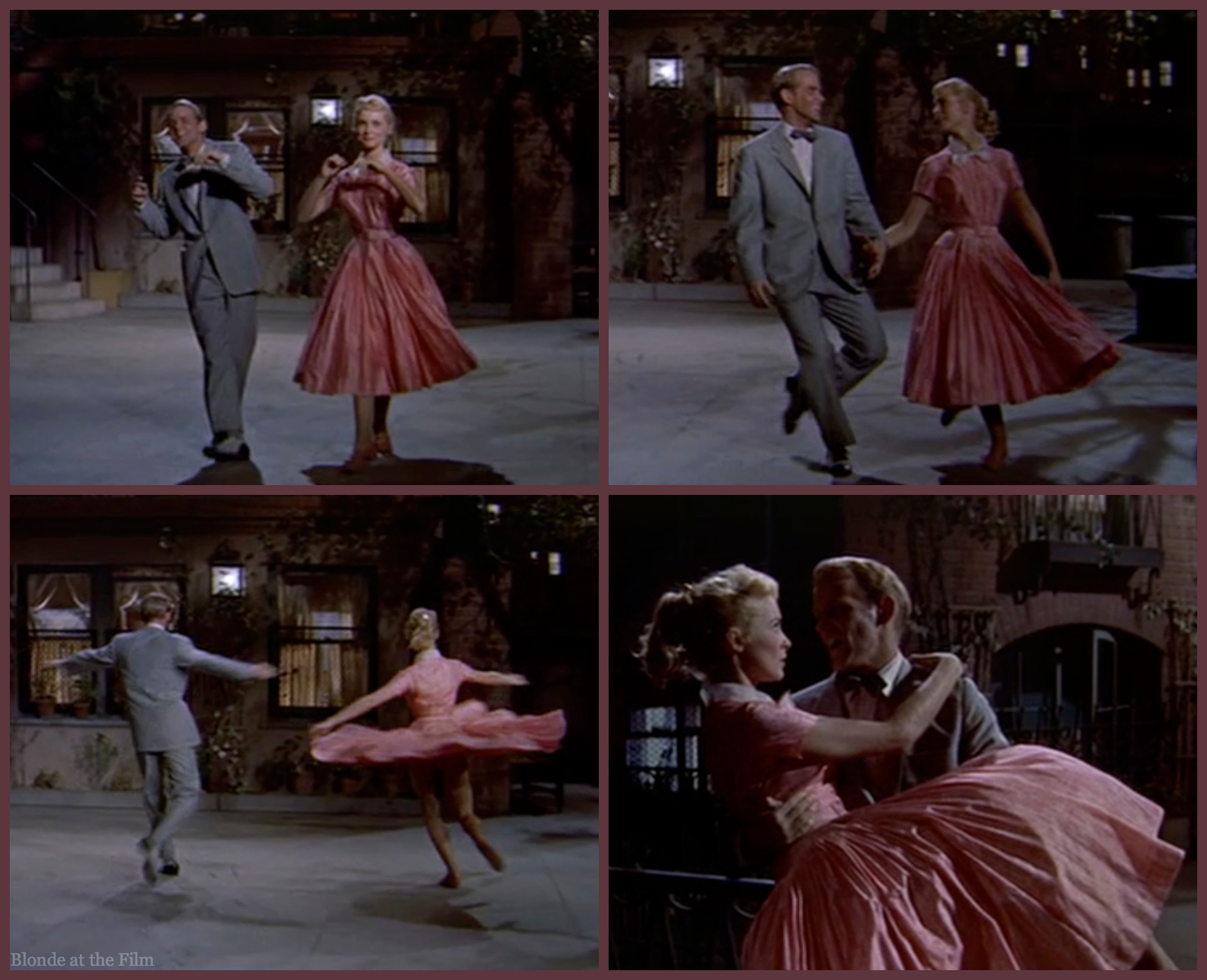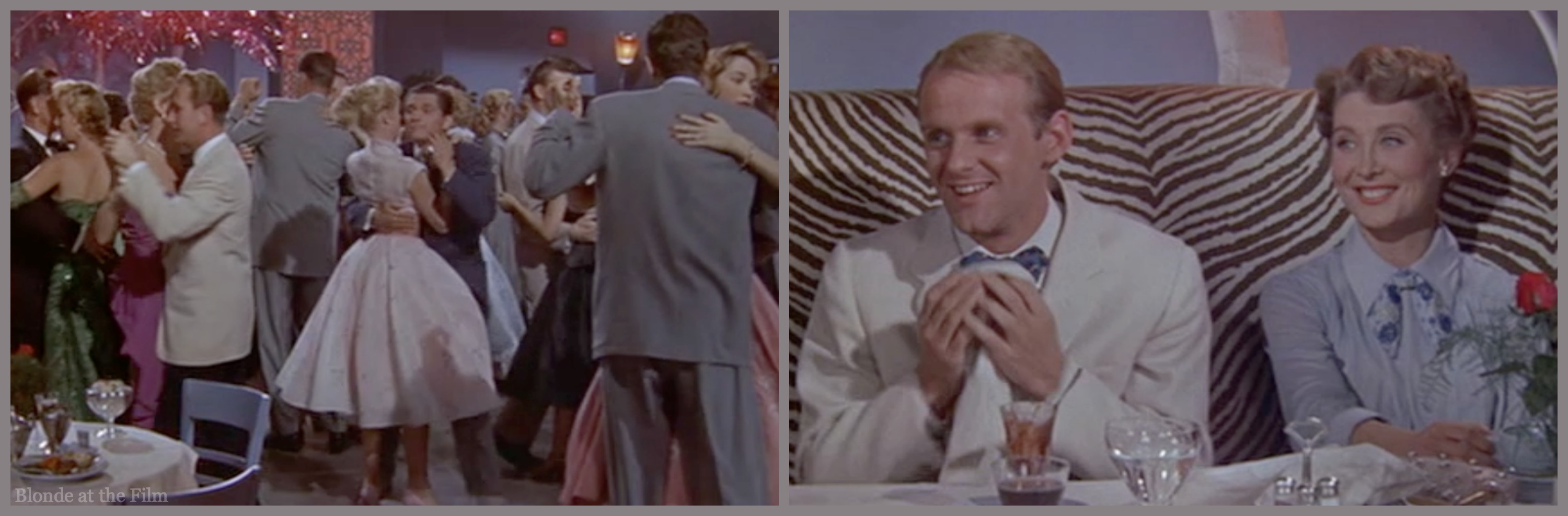 The costumes also play a tricky game with Eileen. Janet Leigh has a teeny-tiny waist and a 1950s torpedo bust–all the trappings of a bombshell. But she’s not a seductress, not in the least, and it’s very important that we trust in Eileen’s innocent goodness (part of the plot is that people often assume the worst about Eileen just because of her appearance). The costumes have to show off her figure and make her look gorgeous enough to turn heads, while maintaining her sweet, girlish character. It’s fun to see how Jean Louis accomplishes this dual, at times-conflicting, task!