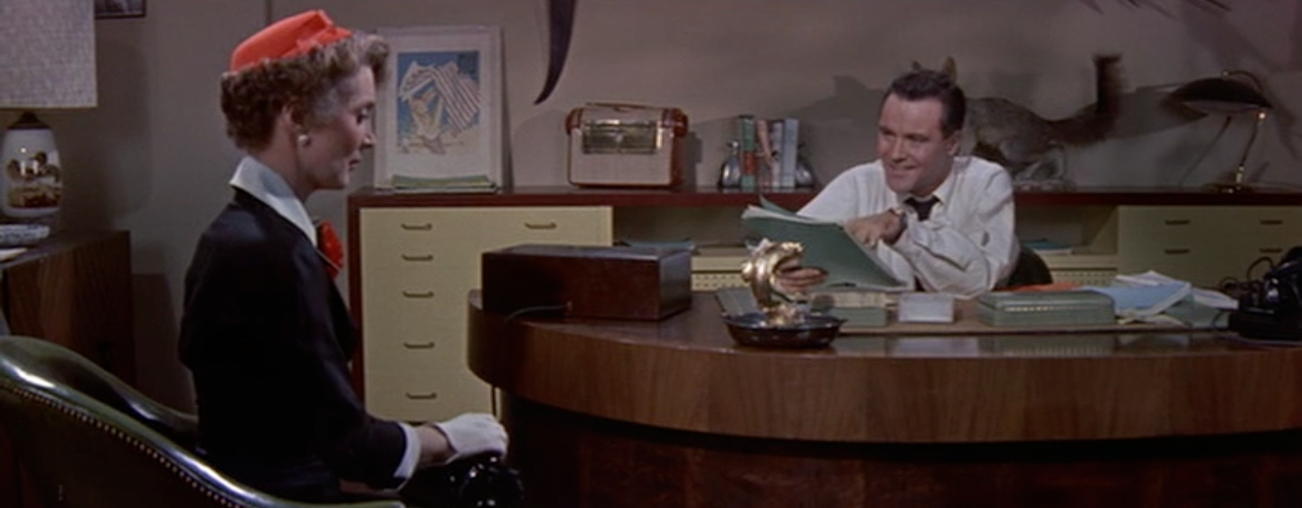 As you can see, this is another of those stretched out, crazy-wide CinemaScope films (like Daddy Long Legs, Kismet, Desk Set, and To Catch a Thief, which was shot in the similarly wide VistaVision). The image is almost twice as wide as the standard Academy ratio. For a more detailed discussion of aspect ratios, check out this website.